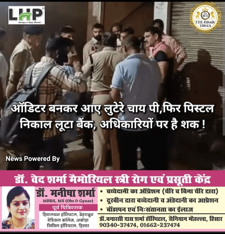 हिसार टाइम्स – हरियाणा के गुरुग्राम में मणप्पुरम गोल्ड लोन शाखा में शनिवार शाम डकैती हो गई। हथियारबंद 5 बदमाशों ने गन पॉइंट पर 4 बैंक कर्मचारियों को बंधक बनाकर साढ़े 9 लाख रुपए की नकदी लूट ली और फरार हो गए।बदमाशों ने फुलप्रूफ प्लानिंग के साथ डकैती की वारदात को अंजाम दिया। उन्हें न केवल मणप्पुरम की सारी वर्किंग की स्टडी की, बल्कि वारदात के लिए छुट्टी का दिन चुना। उन्हें पहले से ही पता था कि शनिवार को जन्माष्टमी की छुट्टी है।
