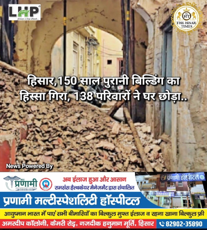 हिसार टाइम्स – हिसार के गांधी चौक के पास 150 साल पुरानी बिल्डिंग का हिस्सा बारिश की वजह से गिर गया, इस दौरान स्कूल जाता है एक बच्चा बाल बाल बच गया, हालांकि गनीमत यह रही कि इस दौरान कोई बड़ा हादसा नहीं हुआ, मामले के बाद पड़ोसियों ने बिल्डिंग मलिक का विरोध किया, मामले की सूचना नगर निगम के अधिकारियों को मिली तो टीम मौके पर पहुंची निगम के एक्सइएन अमित कौशिक ने बताया कि बिल्डिंग को लेकर कोर्ट केस चल रहा है, एसडीओ ने जेई को मौके पर भेजा था, उन्होंने बताया की पहले ही बिल्डिंग मलिक को नोटिस दिया हुआ था !