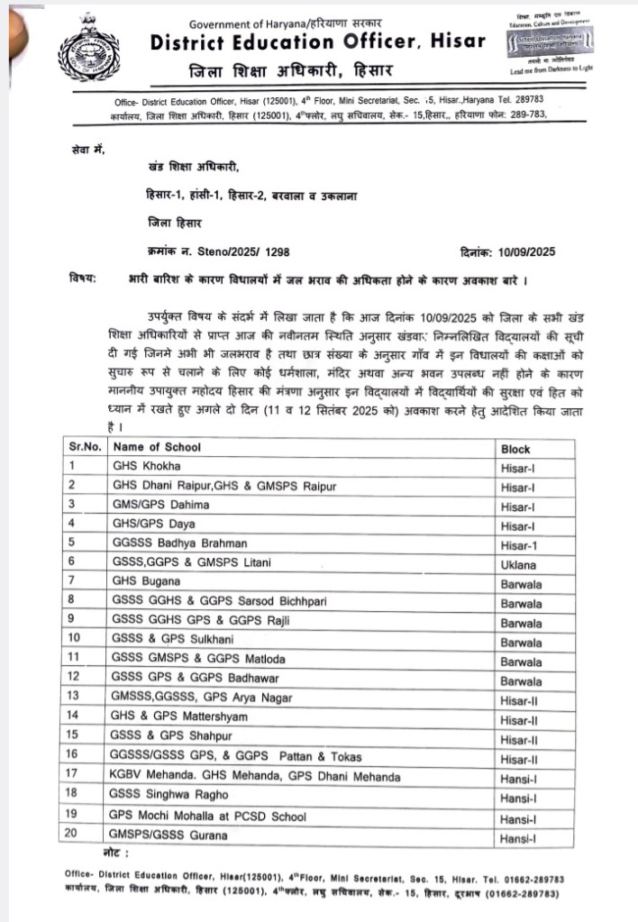 Education, Top News कल से इन स्कूलों में रहेगी छुट्टी ! Date: September 10, 2025Author: Puneet Wadhwa भारी बारिश के कारण विद्यालयों में जल भराव की अधिकता होने के कारण अवकाश बारे l हिसार- प्रॉपर्टी डीलर ने जहर निगला ! हिसार- हीरो बाइक एजेंसी संचालक को क्राइम ब्रांच ने गिरफ्तार किया ! Share this: Share on X (Opens in new window) X Share on Facebook (Opens in new window) Facebook Email a link to a friend (Opens in new window) Email Share on WhatsApp (Opens in new window) WhatsApp Share on LinkedIn (Opens in new window) LinkedIn Like Loading... Related