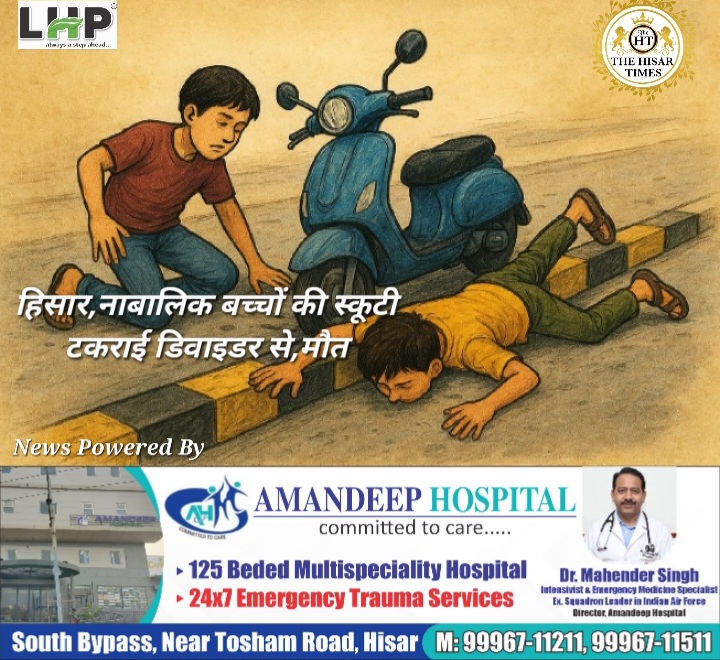 हिसार टाइम्स – मधुबन पार्क वीटा बूथ के सामने गुरुवार की सुबह करीब 7:30 बजे हादसे में स्कूटी सवार एक नाबालिक बच्चों की मौत हो गई व दूसरा गंभीर रूप से घायल हो गया, 13,13 साल के दोनों बच्चे सेक्टर 14 से इ स्कूटी लेकर निकले थे, स्कूटी अनियंत्रित होकर डिवाइडर से टकरा गई दोनों के सर में गंभीर चोटे आई हैं, मृतक परिवार का इकलौता बेटा था उसकी एक बहन है, परिवार नें पोस्टमार्टम व कानूनी कार्रवाई से इंकार कर दिया है, एसडीएम की अनुमति लेकर बच्चे का अंतिम संस्कार कर दिया