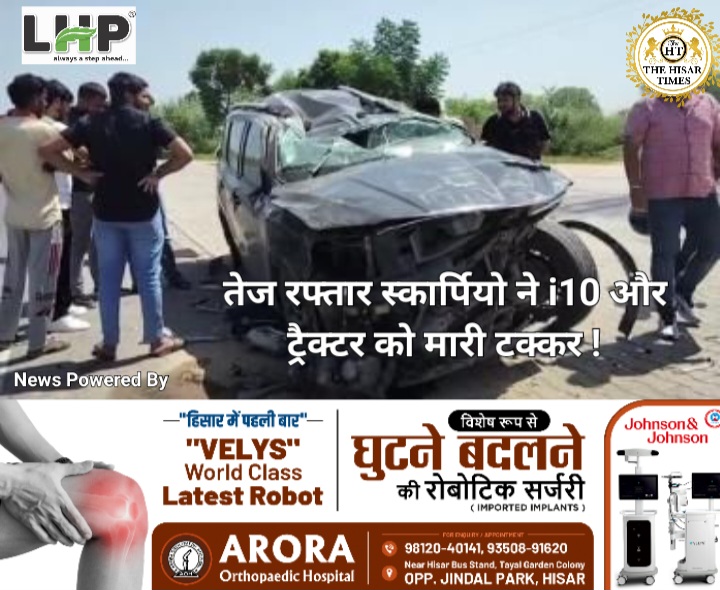 हिसार टाइम्स – दिल्ली हिसार रोड पर केएफसी रेस्टोरेंट के समीप मंगलवार सुबह करीब साढ़े 11 बजे एक तेज रफ्तार स्कॉर्पियो ने ट्रैक्टर-ट्रॉली व आई-10 कार को टक्कर मार दी। हादसे में महिला समेत 6 लोग घायल हो गए। तेज रफ्तार स्कॉर्पियो पहले ट्रैक्टर-ट्रॉली से टकराई। टक्कर के बाद संतुलन बिगड़ने से ट्रैक्टर पलट गया। इसके बाद स्कॉर्पियो ने डिवाइडर पार करके हिसार की तरफ जा रही एक कार से टकराई गई। हादसे में महिला, सेवानिवृत्त एक्सईएन सहित कुल छह लोग घायल हो गए।