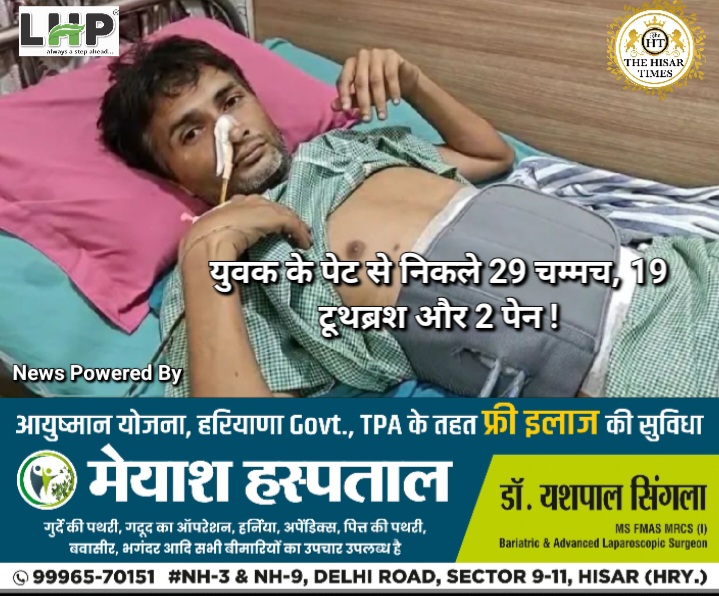 नोट – नीचे कॉलम में देखें > हिसार टाइम्स जॉब्स क्लासिफाइड > आज की बड़ी खबरें फटाफट… ———————————————————————— हिसार टाइम्स – हापुड़ जिले में एक अत्यंत असामान्य और हैरान कर देने वाला मामला सामने आया है। 40 वर्षीय सचिन नामक युवक की पेट दर्द की शिकायत पर संस्थागत अस्पताल में लाया गया। जांच में यह … Continue reading युवक के पेट से निकले 29 चम्मच, 19 टूथब्रश और 2 पेन !