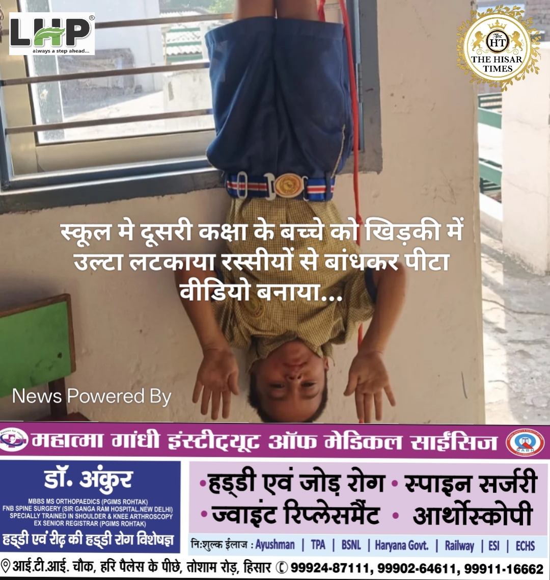 नोट – नीचे कॉलम में देखें > हिसार टाइम्स जॉब्स क्लासिफाइड > आज की बड़ी खबरें फटाफट… ——————————————————————— हिसार टाइम्स – सावधान रहें बच्चों के स्कूल एवं बस चालकों के बारे में पूरी जानकारी रखें◾दूसरी कक्षा के बच्चे को खिड़की में उल्टा लटकाया, प्रिंसिपल ने डांटने के लिए ड्राइवर बुलाया, उसने रस्सियों से बांधकर पीटा और … Continue reading स्कूल मे दूसरी कक्षा के बच्चे को खिड़की में उल्टा लटकाया रस्सीयों से बांधकर पीटा वीडियो बनाया…