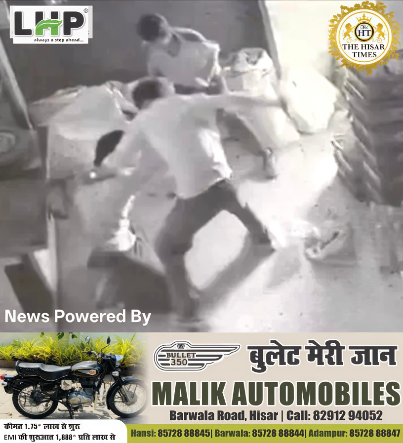 हिसार टाइम्स – हिसार में एक युवक की दिनदहाड़े हत्या कर दी गई। 2 बदमाशों ने दुकान में घुसकर युवक को 14 बार चाकुओं से गोदा। इसके बाद हमलावर बाइक पर फरार हो गए। पूरी घटना दुकान में लगे CCTV कैमरे में कैद हो गई। इसमें हमलावर युवक को चाकू मारते दिख रहे हैं। एक ने गोली मारने की भी कोशिश की, लेकिन पिस्टल लोड नहीं हुई।
