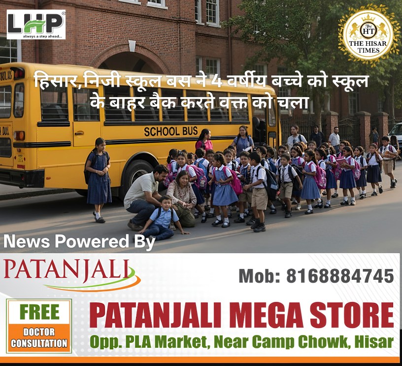 हिसार टाइम्स – हिसार के कैमरी रोड स्थित एक निजी स्कूल के बाहर शनिवार को स्कूल बस ने चार वर्षीय बच्चे को कुचल दिया। गंभीर घायल बच्चे को निजी अस्पताल में भर्ती करवाया गया, जहां देर रात उपचार के दौरान मौत हो गई। पुलिस ने रविवार को पोस्टमार्टम के बाद शव परिजनों को सौंप दिया है।
