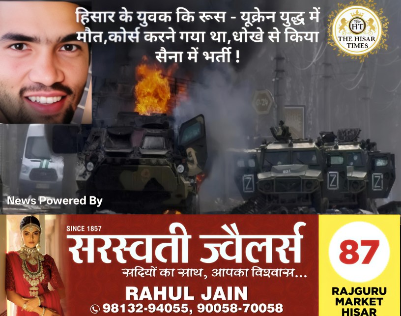 हिसार टाइम्स – हिसार जिले के गांव मदनहेड़ी का 28 वर्षीय सोनू की रूस-यूक्रेन युद्ध में रूसी सेना की ओर से लड़ते हुए मौत हो गई। रूस की सेना के एक अधिकारी ने उसके परिवार को पत्र भेजकर इसकी जानकारी दी है।