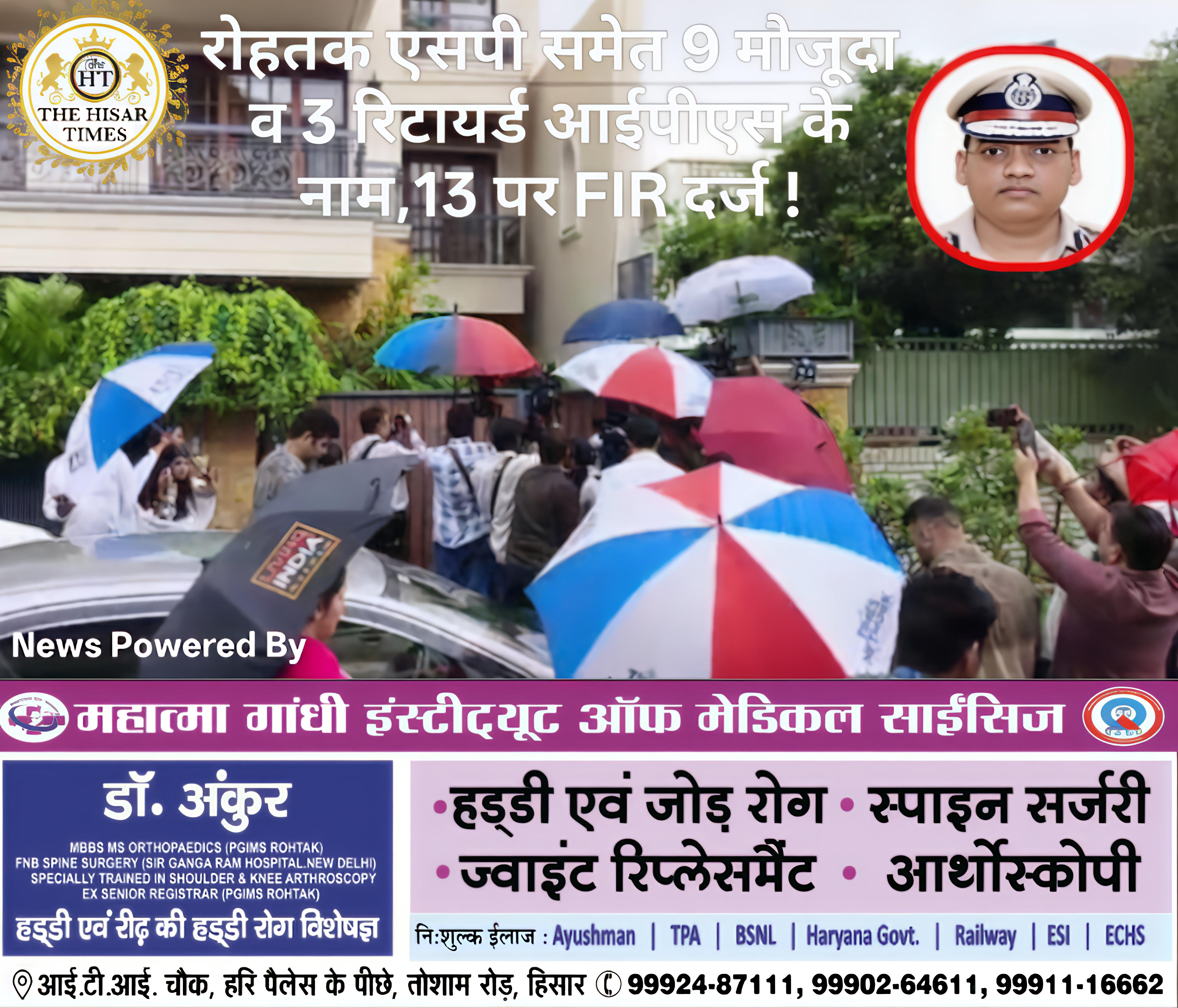नोट – नीचे कॉलम में देखें > हिसार टाइम्स जॉब्स क्लासिफाइड > आज की बड़ी खबरें फटा फट… हिसार टाइम्स -हरियाणा में सुसाइड के लिए मजबूर करने के आरोपियों में रोहतक एसपी समेत 9 मौजूदा व 3 रिटायर्ड आईपीएस के नाम, 13 पर FIR दर्ज इनके नाम शामिल,DGP शत्रुजीत कपूर,नरेंद्र विजारनिया डीजीपी, एसपी रोहतक,टीवीएसएन प्रसाद … Continue reading सुसाइड के लिए मजबूर करने के आरोप में रोहतक एसपी समेत 9 मौजूदा व 3 रिटायर्ड आईपीएस के नाम,13 पर FIR दर्ज !