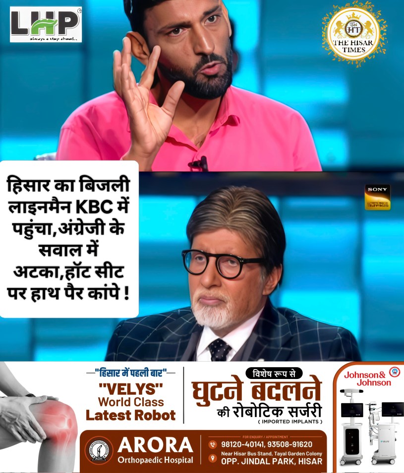 हिसार टाइम्स – हिसार जिले के के रहने वाले एक असिस्टेंट लाइनमैन ने टीवी के मशहूर क्विज शो कौन बनेगा करोड़पति (KBC) में 5 लाख रुपए जीते हैं। इसके अलावा उसे एक बाइक और सोने के 2 सिक्के भी पुरस्कार स्वरूप दिए गए।असिस्टेंट लाइनमैन का नाम सोनू सिंह है। वह उकलाना क्षेत्र के गांव पाबड़ा के रहने वाले हैं। जब वह KBC से लखपति बनकर लौटे तो गांव में उनका जोरदार स्वागत किया गया। एक सामान्य परिवार से संबंध रखने वाले सोनू सिंह की कामयाबी पर पूरे गांव ने एक-दूसरे को मिठाई खिलाकर जश्न मनाया।