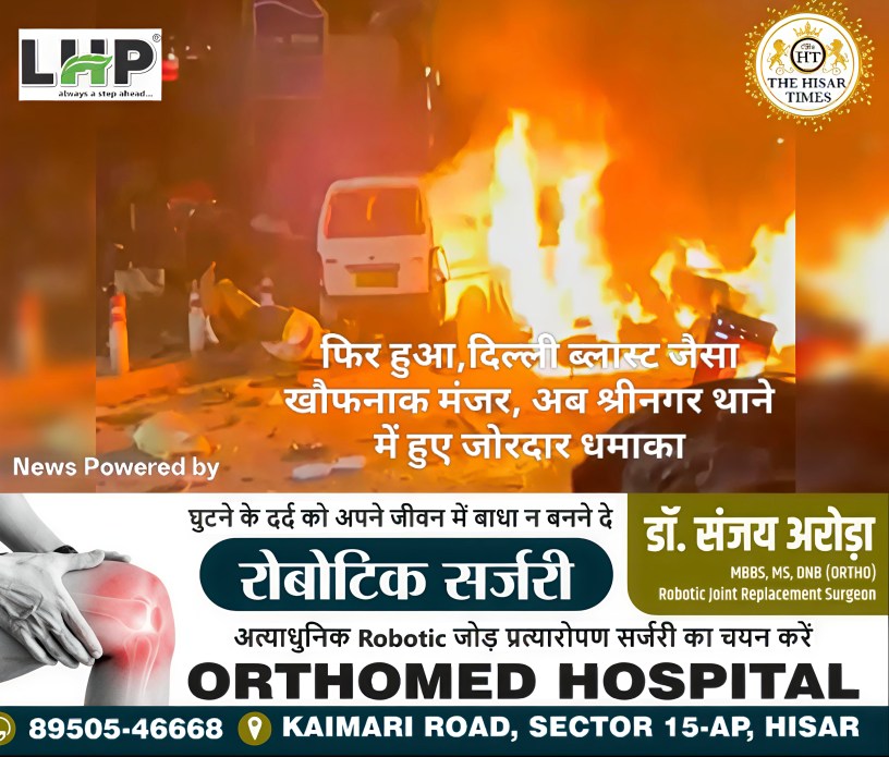 हिसार टाइम्स – दिल्ली में लाल किले के सामने 10 नवंबर को हुए घातक विस्फोट जैसा ही खौफनाक मंजर श्रीनगर में कल रात देखने को मिला। श्रीनगर के नौगाम थाने में हुए धमाके में छह लोगों की मौत हो गई और दो दर्जन से अधिक घायल हो गये। घायलों में अधिकांश पुलिसकर्मी हैं। घायलों को इलाज के लिए उजाला सिग्नस, SMHS और 92 बेस अस्पताल में शिफ्ट किया गया है। धमाका इतना जबरदस्त था कि आसपास के घरों के शीशे टूट गए और इसकी आवाज कई किलोमीटर दूर तक सुनी गई. रिपोर्ट्स के अनुसार, रात करीब 11:22 बजे बड़ा धमाका नौगाम पुलिस स्टेशन के आसपास हुआ है.