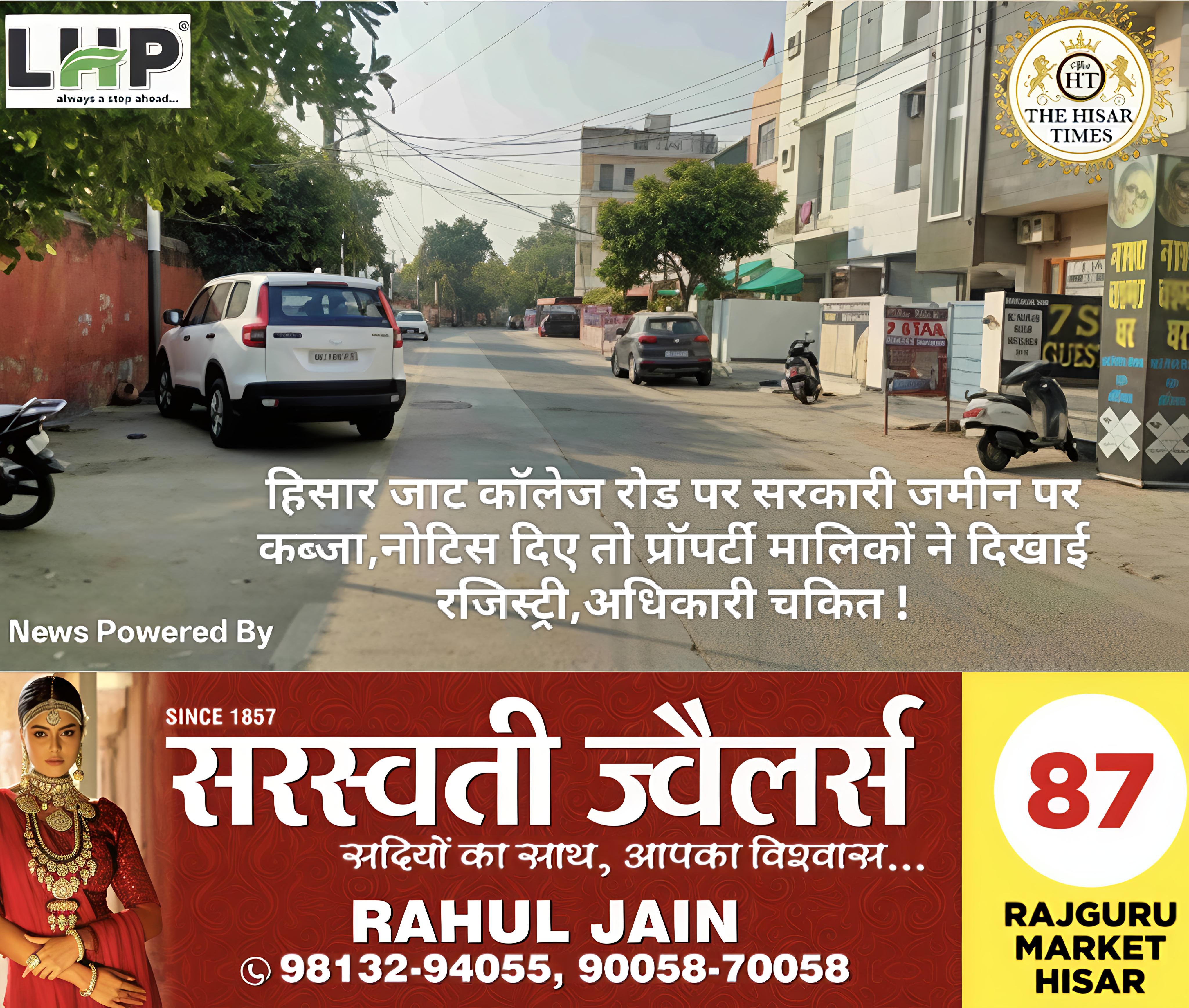 नोट – नीचे कॉलम में देखें > हिसार टाइम्स जॉब्स क्लासिफाइड > आज की बड़ी खबरें फटा फट… ➖➖➖➖➖➖➖➖➖➖➖➖➖➖➖ हिसार टाइम्स – हिसार मे बीएंडआर विभाग ने जाट कॉलेज रोड पर स्थित अपनी जमीन की पैमाइश करवाई तो 1872 वर्ग गज भूमि पर कब्जे पाए गए। संबंधित प्रॉपर्टी मालिकों को नोटिस जारी किए तो कइयों … Continue reading हिसार जाट कॉलेज रोड पर सरकारी जमीन पर कब्जा,नोटिस दिए तो प्रॉपर्टी मालिकों ने दिखाई रजिस्ट्री,अधिकारी चकित !