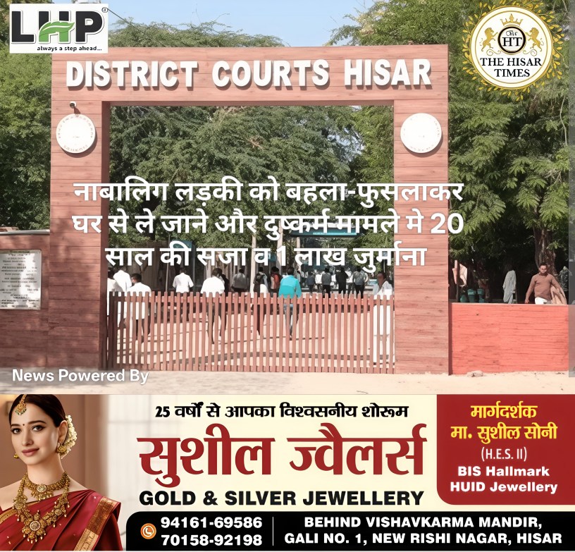 हिसार टाइम्स – नाबालिग लड़की को बहला-फुसलाकर घर से ले जाने और दुष्कर्म करने के मामले में जिला अदालत ने मंगलवार को दोषी मनीष को 20 साल की सजा सुनाई है। एडीजे सुनील जिंदल की अदालत ने दोषी को 1 लाख का जुर्माना लगाया है। यह मामला वर्ष 2021 का है, जब सदर थाना एरिया के एक गांव के व्यक्ति ने पुलिस को अपनी 17 वर्षीय बेटी के लापता होने की शिकायत दी थी।