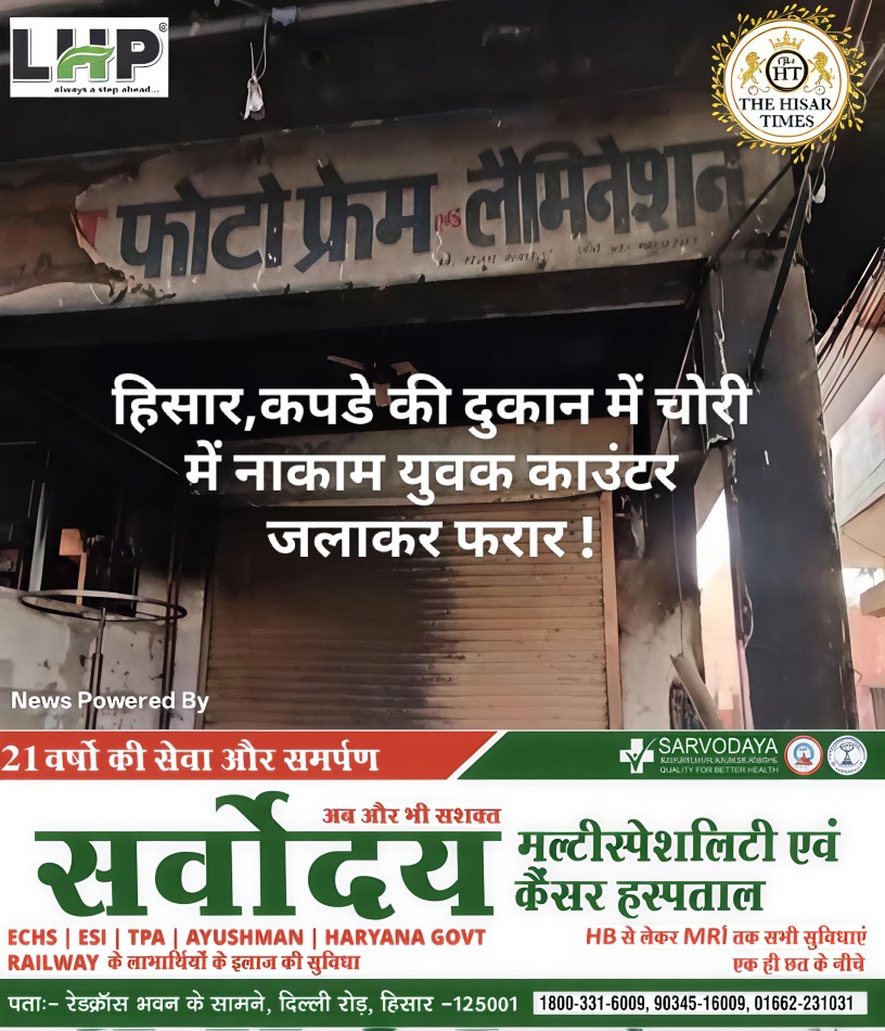 हिसार टाइम्स – पटेल नगर में गारमेंट शॉप पर सोमवार देर रात करीब सवा 2 बजे बाइक सवार 2 अज्ञात युवकों ने शटर उखाड़कर चोरी का प्रयास किया। इसमें नाकाम रहने पर बाहर रखा लकड़ी का काउंटर जलाकर फरार हो गए। गनीमत रही कि वहां से गुजरती पुलिस की पेट्रोलिंग टीम की आग पर नज़र पड़ गई। तुरंत आग बुझाने का प्रयास शुरू किया।