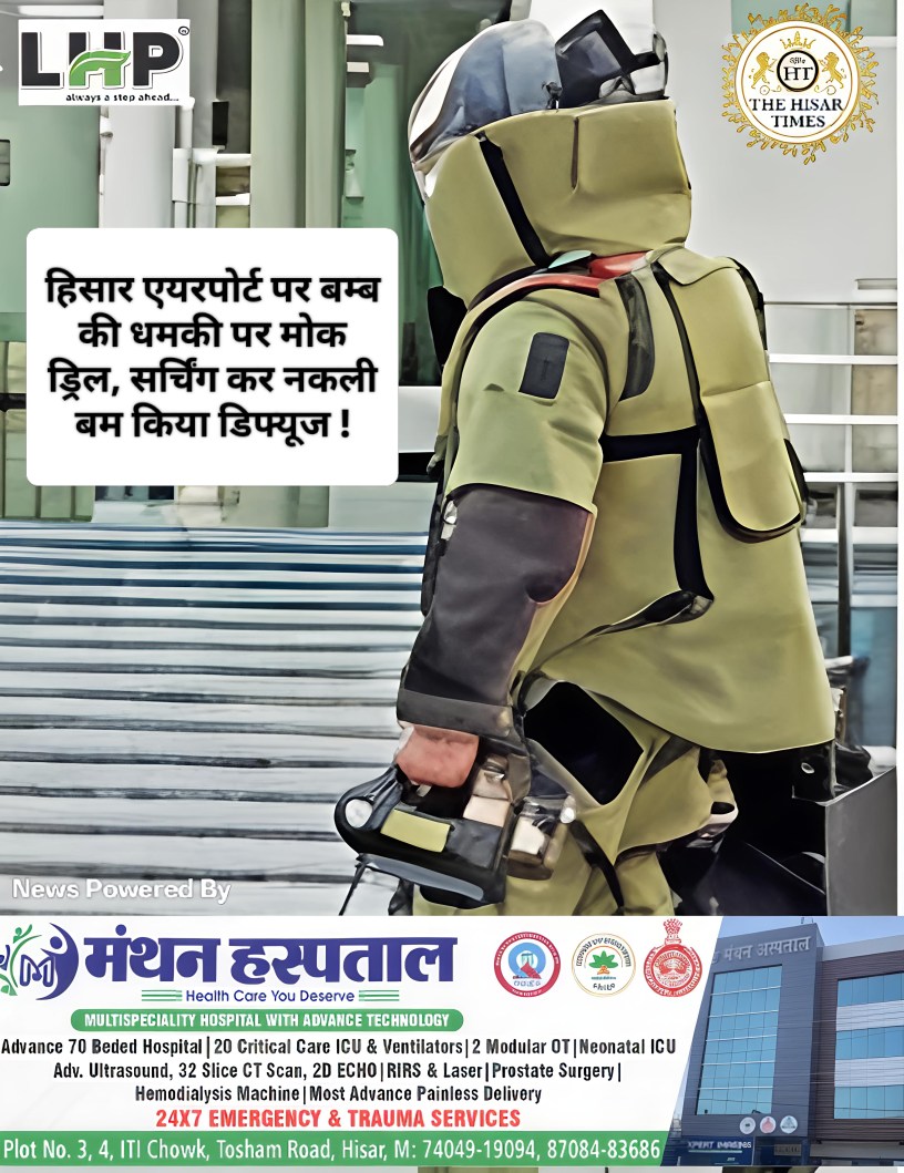 हिसार टाइम्स – महाराजा अग्रसेन हिसार एयरपोर्ट पर गुरुवार को स्टेट पुलिस को बम की धमकी मिलने पर बम डिफ्यूज कर सुरक्षित निकासी का एक मॉक ड्रिल (अभ्यास) आयोजित किया। हवाई अड्डे के अंदर मॉक ड्रिल के दौरान वास्तविक समय में बम की धमकी जैसा माहौल दिया गया।