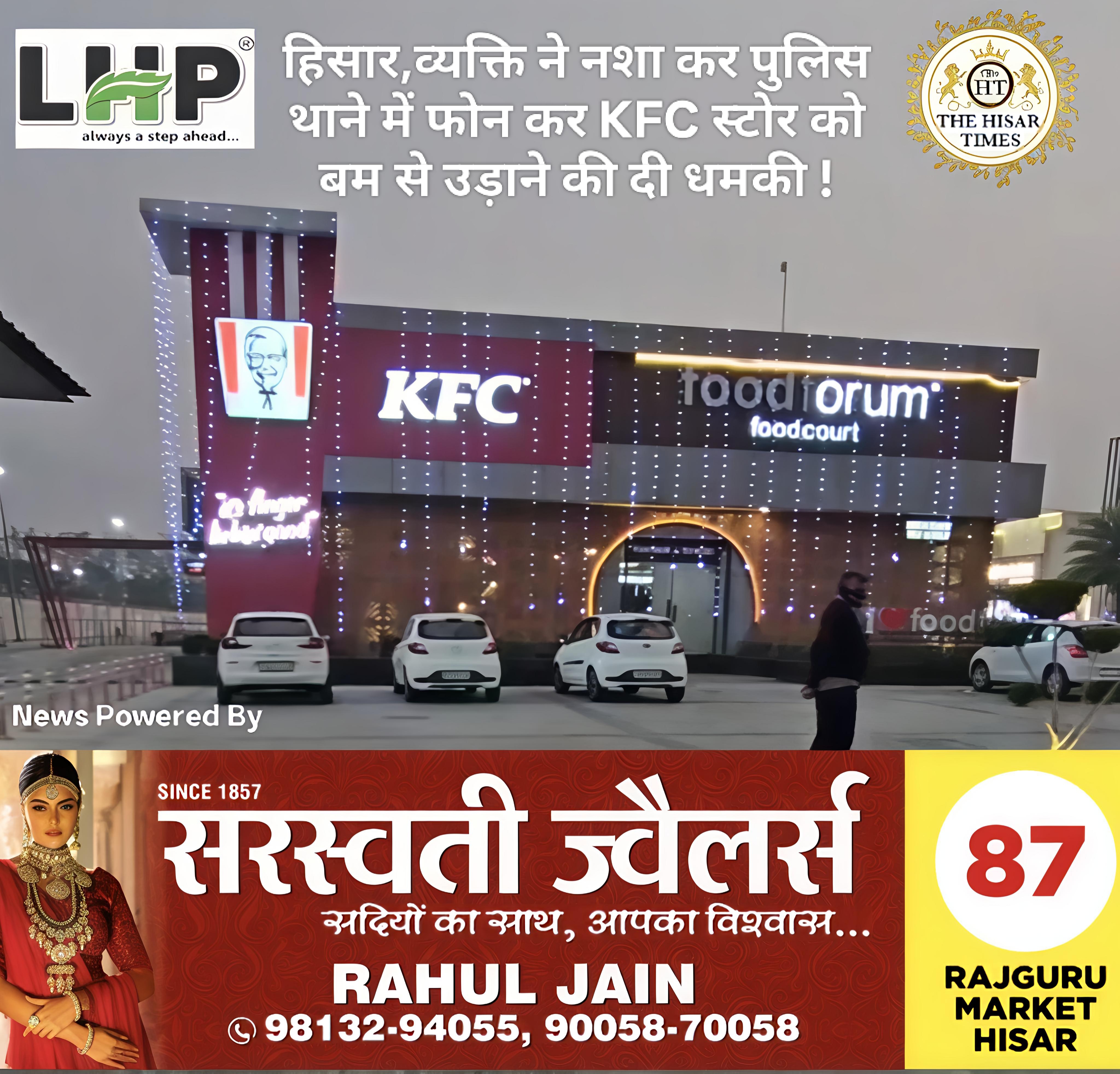 नोट – नीचे कॉलम में देखें > हिसार टाइम्स जॉब्स क्लासिफाइड > आज की बड़ी खबरें फटा फट… ➖➖➖➖➖➖➖➖➖➖➖➖➖➖➖ हिसार टाइम्स – हांसी पुलिस मुख्यालय में फोन कर रामायण टोल प्लाजा के पास स्थित केएफसी के स्टोर को बम से उड़ाने की धमकी से हड़कंप मच गया। मुख्यालय से सूचना मिलते ही हांसी पुलिस ने … Continue reading हिसार,नौकरी से निकाले गए व्यक्ति ने नशा कर पुलिस थाने में फोन कर KFC स्टोर को बम से उड़ाने की दी धमकी !