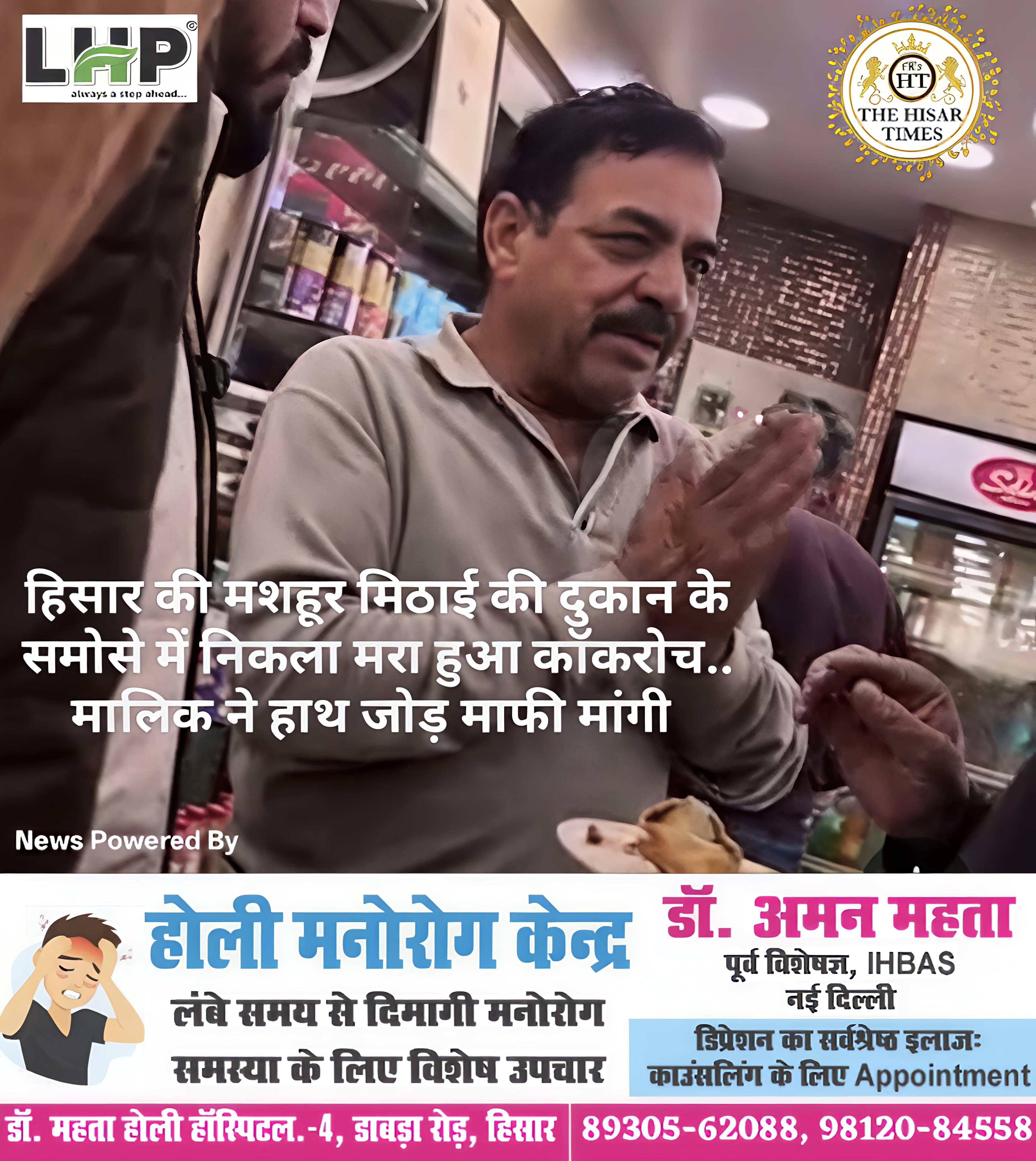 हिसार की मशहूर मिठाई की दुकान के समोसे में मरा कॉकरोच निकला, खाते ही SDO के परिवार को उल्टियां लगी !