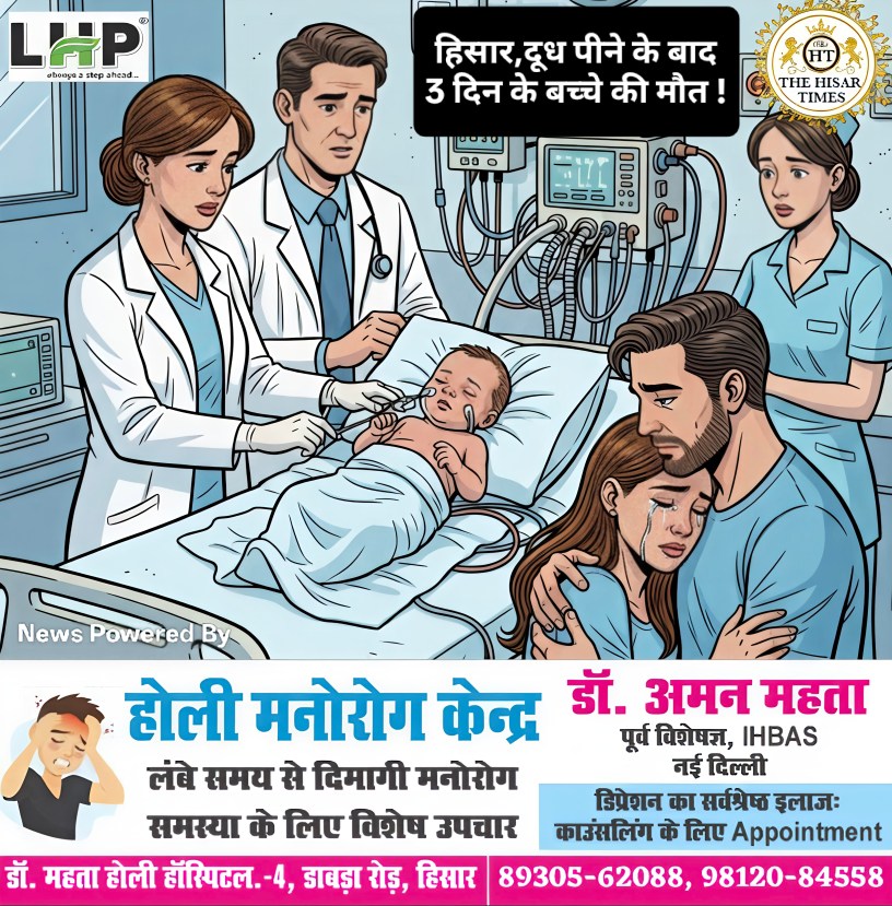 हिसार टाइम्स – शहर की एक कॉलोनी में तीन दिन के बच्चे की मौत हो गई। उसे मां ने दूध पिलाकर लिटा दिया था। इसके बाद वह अचेत मिला। दिव्यांग पिता गोद में बच्चे को लेकर नागरिक अस्पताल पहुंचे। दौड़ते हुए इमरजेंसी में दाखिल करवाया। डॉक्टर व स्टाफ ने जांच करके उसे मृत घोषित कर दिया।