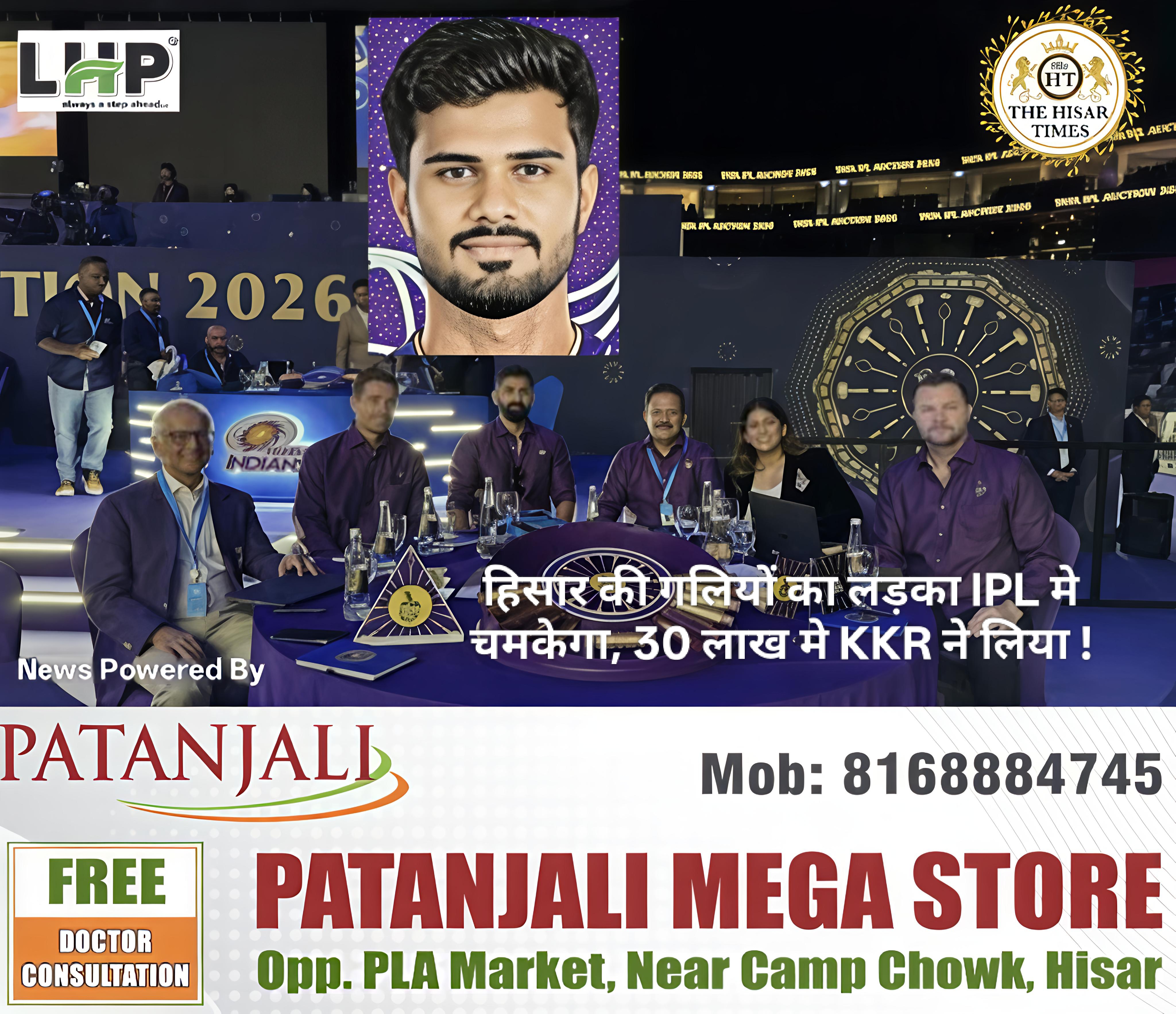 नोट – नीचे कॉलम में देखें > हिसार टाइम्स जॉब्स क्लासिफाइड > आज की बड़ी खबरें फटा फट… ➖➖➖➖➖➖➖➖➖➖➖➖➖➖➖ ◾दक्ष कामरा को आईपीएल-2026 में केकेआर ने 30 लाख की बोली पर चुना हिसार टाइम्स – हिसार की मिट्टी से निकला एक और सितारा अब आईपीएल के आसमान पर चमकने को तैयार है। शहर के जहाजपुल … Continue reading हिसार की गलियों का लड़का IPL मे चमकेगा, 30 लाख मे KKR ने लिया !