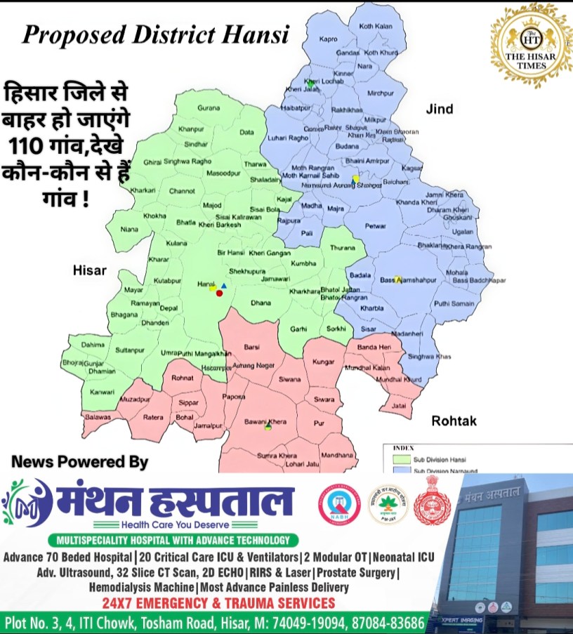 ◾हांसी जिले में हांसी और नारनौंद विधानसभा क्षेत्रों के 110 गांव होंगे शामिल