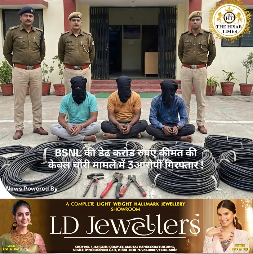 इस मामले में तीन आरोपी पहले ही गिरफ्तार किए जा चुके हैं। पुलिस प्रवक्ता विकास ने बताया कि बीएसएनएल, हिसार की ओर से दर्ज शिकायत में बताया गया कि 11 और 12 सितंबर की रात करीब 11 बजे से सुबह 4 बजे के बीच रेलवे क्रॉसिंग लक्ष्मीबाई चौक से कैंप चौक और चूड़ामणि चौक तक स्थित अंडरग्राउंड डक्ट से बीएसएनएल की कॉपर केबल चोरी कर ली गई। दावा किया गया कि चोरी की गई केबल की अनुमानित कीमत करीब 1.53 करोड़ रुपये है।