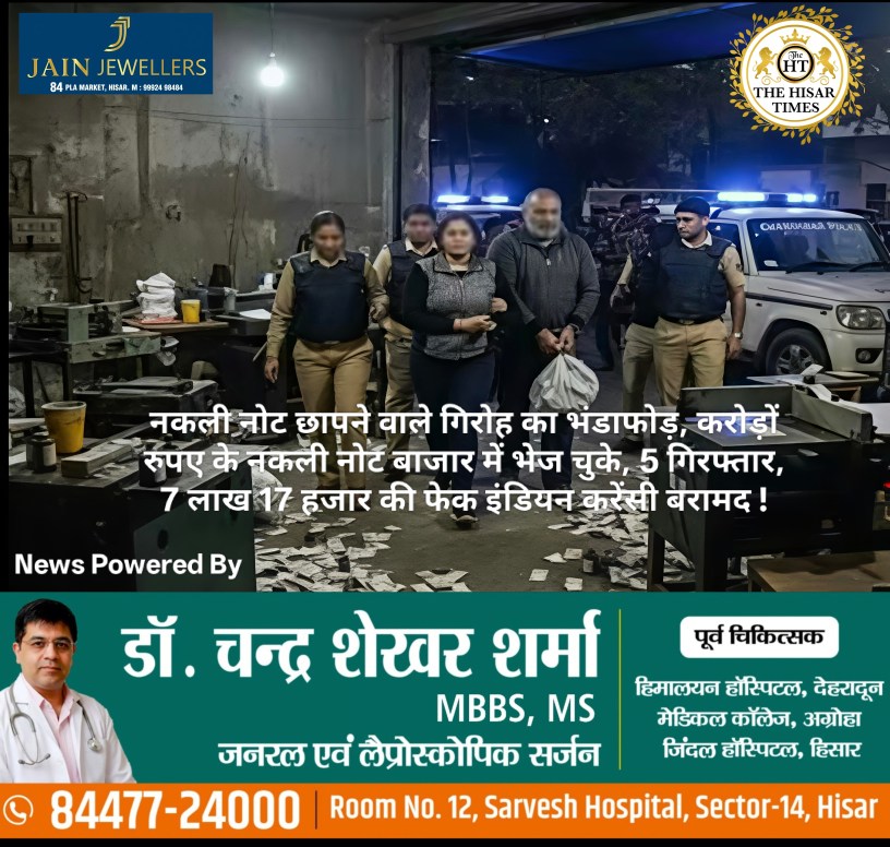 हिसार टाइम्स – शुक्रवार को चंडीगढ़ पुलिस ने नकली नोट छापने वाले बड़े और संगठित गिरोह का पर्दाफाश किया. पुलिस ने अभी तक नकली नोट छापने वाले गिरोह के 5 आरोपियों को गिरफ्तार किया और इनके कब्जे से करीब 7 लाख 17 हजार 400 रुपये के नकली नोट बरामद किए. शुरुआती जांच में सामने आया है कि ये गिरोह लंबे समय से चंडीगढ़ में सक्रिय था. जो अब तक करोड़ों रुपये के नकली नोट बाजारों में भेज चुका है.