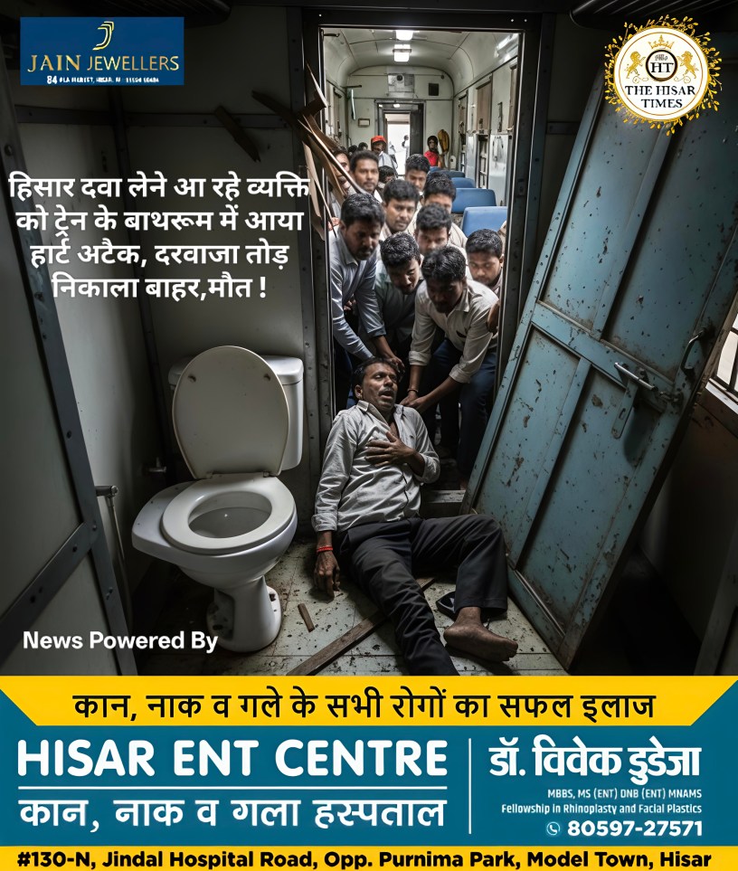 हिसार टाइम्स -हांसी में ट्रेन में एक यात्री की हार्ट अटैक से मौत हो गई। चरखी दादरी के नरेश (54) अपने बेटे के साथ हिसार जा रहे थे। यह घटना तब सामने आई जब नरेश ट्रेन के बाथरूम में गए और काफी देर तक बाहर नहीं निकले। जीआरपी पुलिस के अनुसार, नरेश अपने बेटे दीपक और एक रिश्तेदार के साथ रेवाड़ी से फाजिल्का जा रही ट्रेन में सवार थे। वे हिसार में दवा लेने जा रहे थे। भिवानी क्रॉस करने के बाद नरेश बाथरूम में गए। काफी समय तक बाहर न आने पर परिजनों को चिंता हुई। उन्होंने दरवाजा खटखटाया तो पता चला कि वह अंदर से बंद है।