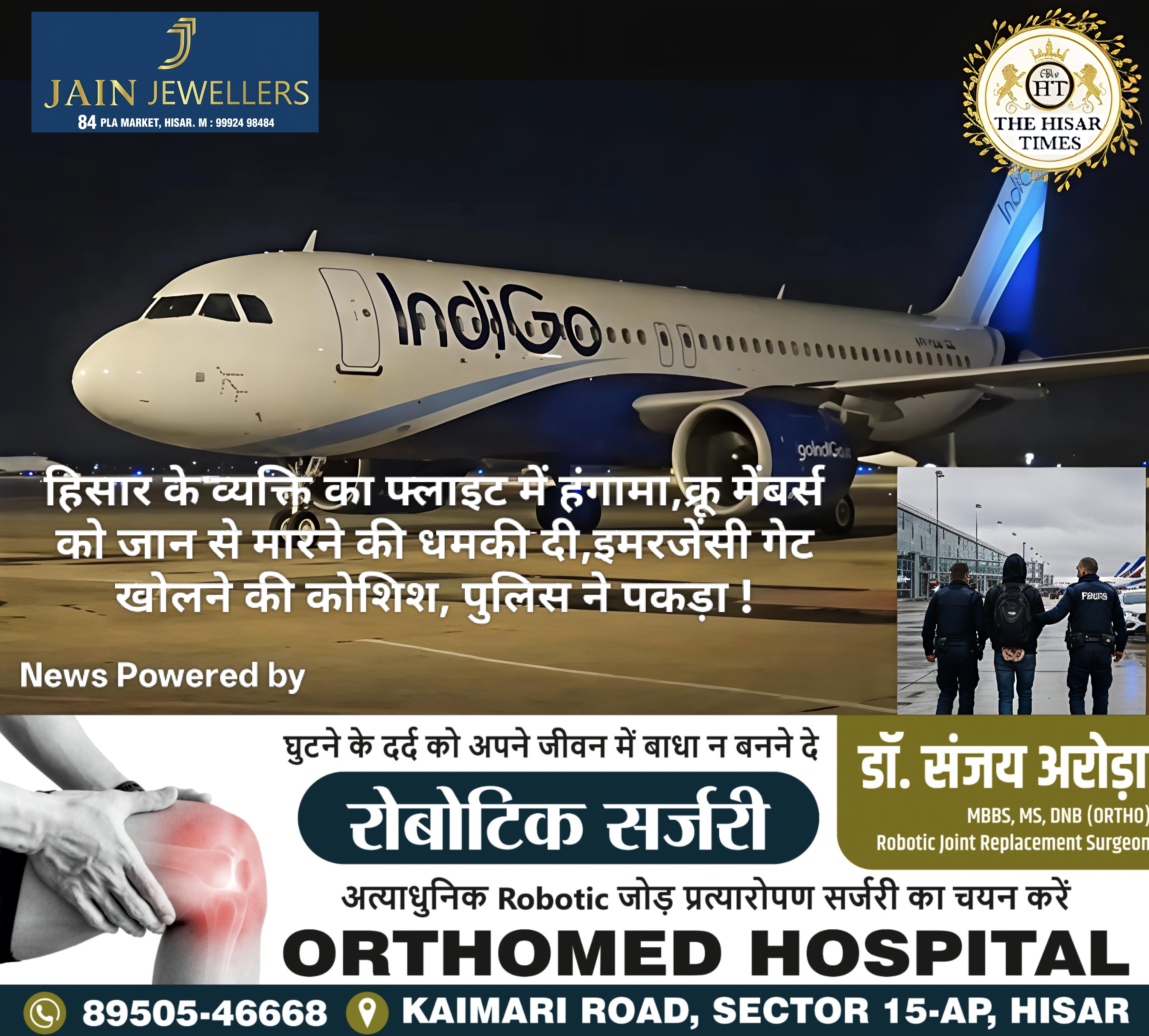 नोट – नीचे कॉलम में देखें > हिसार टाइम्स जॉब्स क्लासिफाइड > आज की बड़ी खबरें फटा फट… ➖➖➖➖➖➖➖➖➖➖➖➖➖➖➖ हिसार टाइम्स – हिसार जिले के बरवाला निवासी एक यात्री ने इंडिगो की फ्लाइट में नशे की हालत में उत्पात मचाकर यात्रियों और क्रू मेंबर्स में अफरा-तफरी फैला दी। उड़ान के दौरान आरोपी ने फ्लाइट का … Continue reading हिसार के व्यक्ति का फ्लाइट में हंगामा,क्रू मेंबर्स को जान से मारने की धमकी दी,इमरजेंसी गेट खोलने की कोशिश, पुलिस ने पकड़ा !