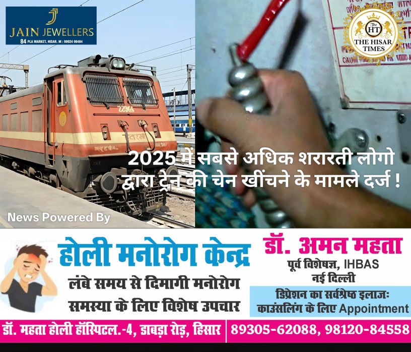 हिसार टाइम्स – हिसार रेलवे क्षेत्र में चेन पुलिंग के मामले लगातार बढ़ रहे हैं। रेलवे की कड़ी सख्ती के बावजूद लोग इस खतरनाक अभ्यास से बाज नहीं आ रहे हैं। पिछले 5 वर्षों में हिसार आरपीएफ थाने में 89 चेन पुलिंग के मामले दर्ज किए। इनमें से दस लोगों को जुर्माने के साथ जेल भी जाना पड़ा।