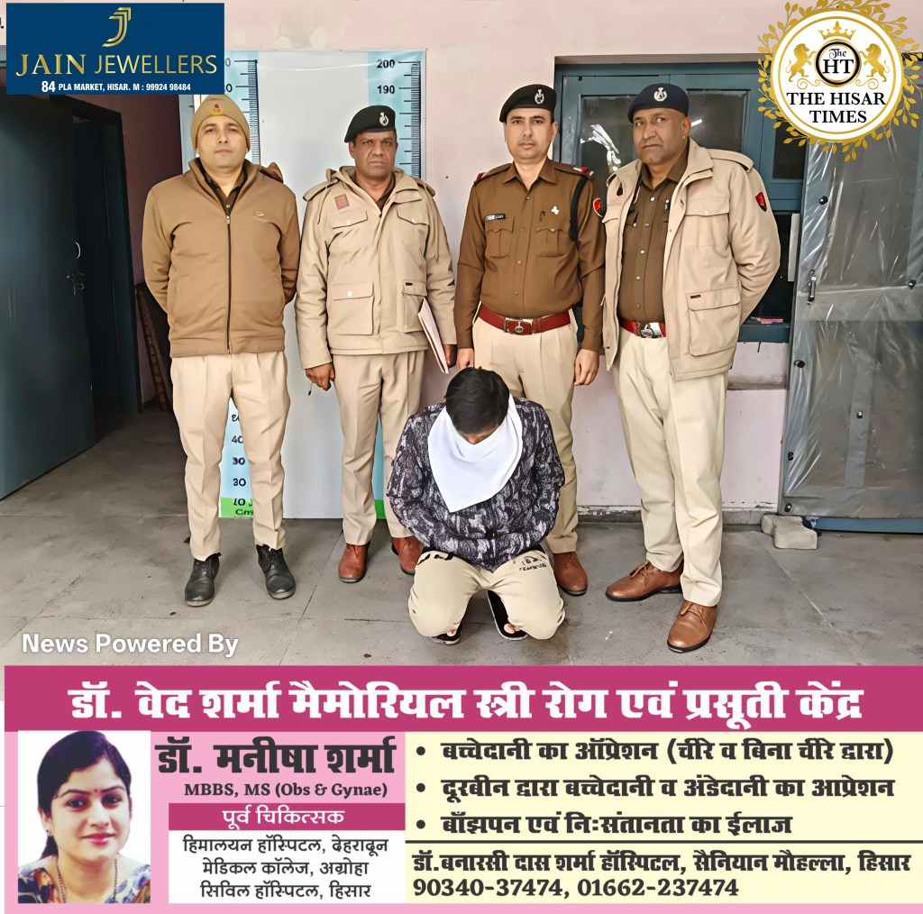 हिसार टाइम्स – हिसार पुलिस की पीएलए चौकी टीम ने ज्वैलरी शॉप से सोने के झुमके चोरी करने के आरोप में एक व्यक्ति को गिरफ्तार किया है। पुलिस अधीक्षक श्री शशांक कुमार सावन के निर्देशों पर कार्रवाई करते हुए पुलिस ने आरोपी के पास से 50 हजार रुपये नकद और चोरी के पैसों से खरीदी गई एक मोटरसाइकिल भी बरामद की है।