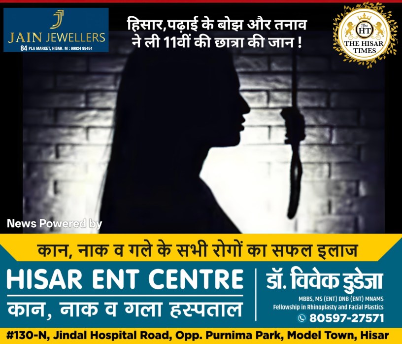 हिसार टाइम्स – हिसार के न्यू मॉडल टाउन से एक दुखद खबर आई है, जहाँ 11वीं कक्षा की छात्रा मानसी ने मानसिक तनाव के चलते आत्महत्या कर ली। मानसी पढ़ाई में काफी होनहार थी और उसने 10वीं में 78% अंक हासिल किए थे। उसका सपना डॉक्टर बनने का था, लेकिन 11वीं में उसने कॉमर्स विषय ले लिया, जिससे वह खुश नहीं थी और लगातार तनाव में रहने लगी।