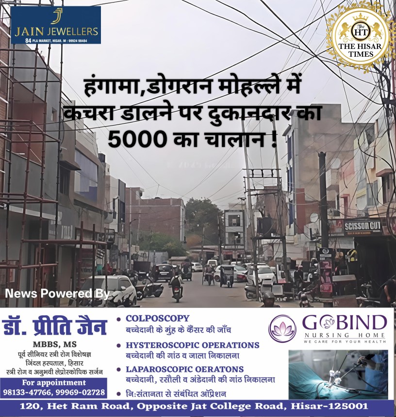 हिसार टाइम्स – हिसार नगर निगम ने सेकेंडरी प्वाइंट पर कचरा डालने पर एक ट्रेडिंग कंपनी से 5 हजार रुपये जुर्माना वसूला। साथ ही निगम ने वार्ड 15 में स्वच्छता जागरूकता कार्यक्रम भी चलाया।