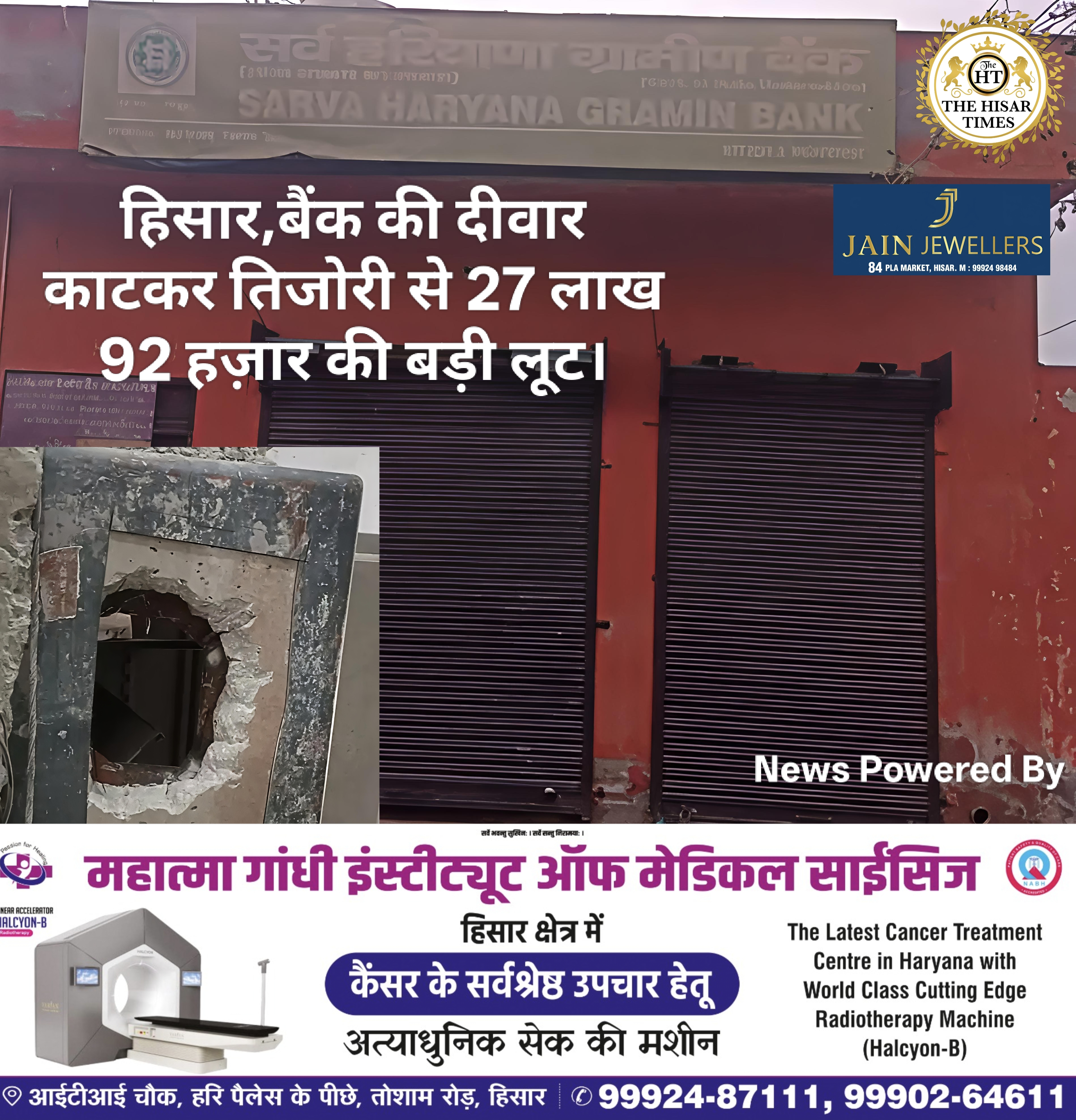 हिसार,बैंक की दीवार काटकर तिजोरी से 27 लाख 92 हज़ार की बड़ी लूट। पुलिस को मिले अहम सुराग !