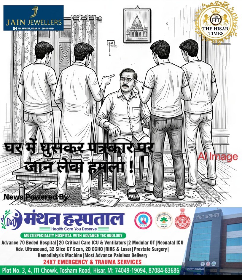 हिसार टाइम्स – नारनौल के शास्त्री नगर में दैनिक जागरण के ब्यूरो चीफ बलवान शर्मा पर रविवार शाम अज्ञात युवकों ने घर में घुसकर जानलेवा हमला किया। सात-आठ हमलावरों ने कड़ों से हाथ और छाती पर वार किए, जिससे उन्हें गंभीर चोटें आईं। उन्हें अस्पताल में भर्ती कराया गया है, जहां उनकी हालत स्थिर है। पुलिस ने जांच शुरू कर दी है और सीसीटीवी फुटेज खंगाल रही है,