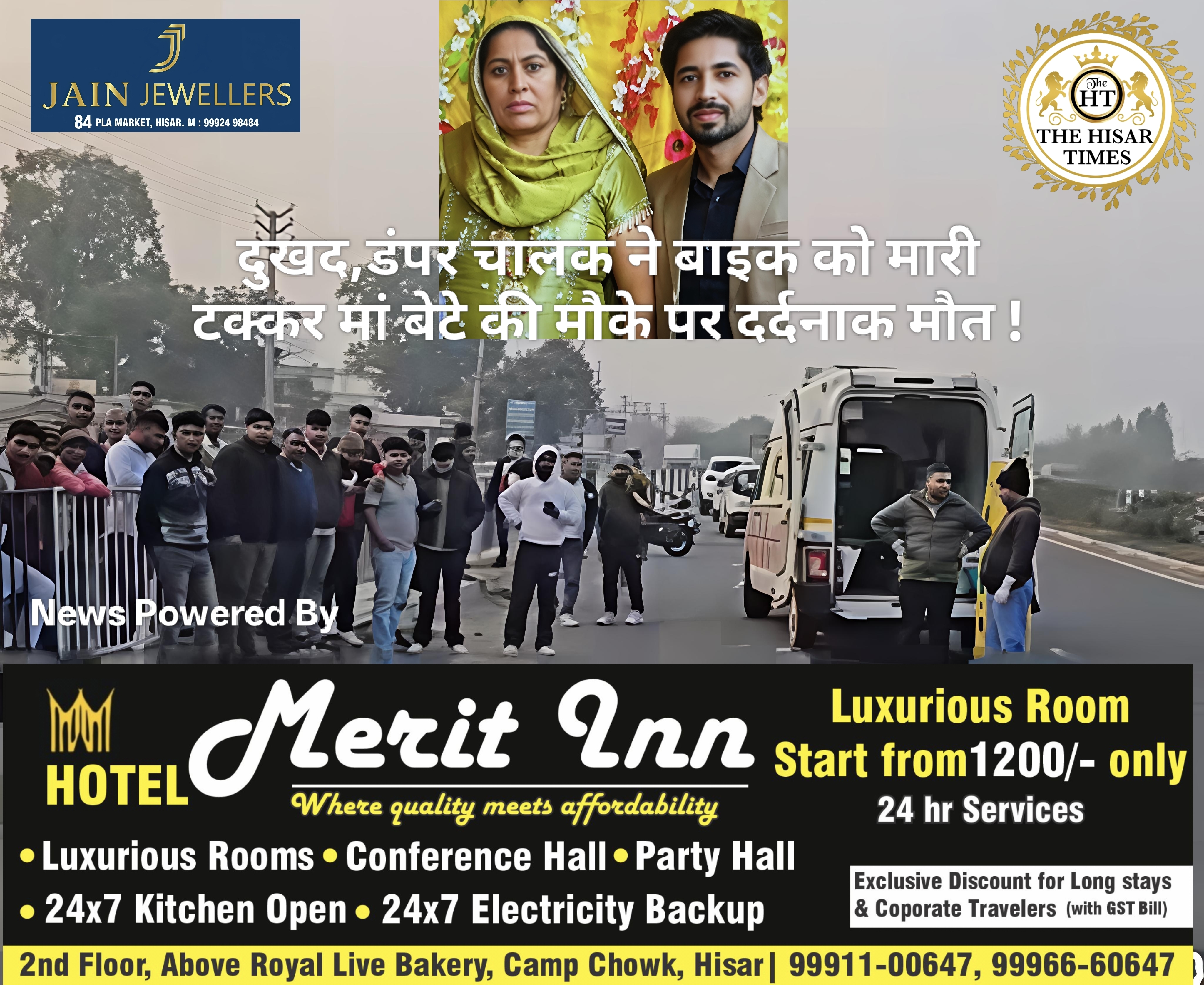 नोट – नीचे कॉलम में देखें > हिसार टाइम्स जॉब्स क्लासिफाइड > आज की बड़ी खबरें फटा फट… For Free Job & News Updates Join Hisar Times News Group https://chat.whatsapp.com/EHzVoGH50MdINoYniG4crH ➖➖➖➖➖➖➖➖➖➖➖➖➖➖➖ हिसार टाइम्स – हिसार मे सिरसा रोड पर तेजा मार्केट के पास सोमवार शाम बजरी से भरे एक डंपर ने बाइक को टक्कर मार … Continue reading दुखद,डंपर चालक ने बाइक को मारी टक्कर मां बेटे की मौके पर दर्दनाक मौत !