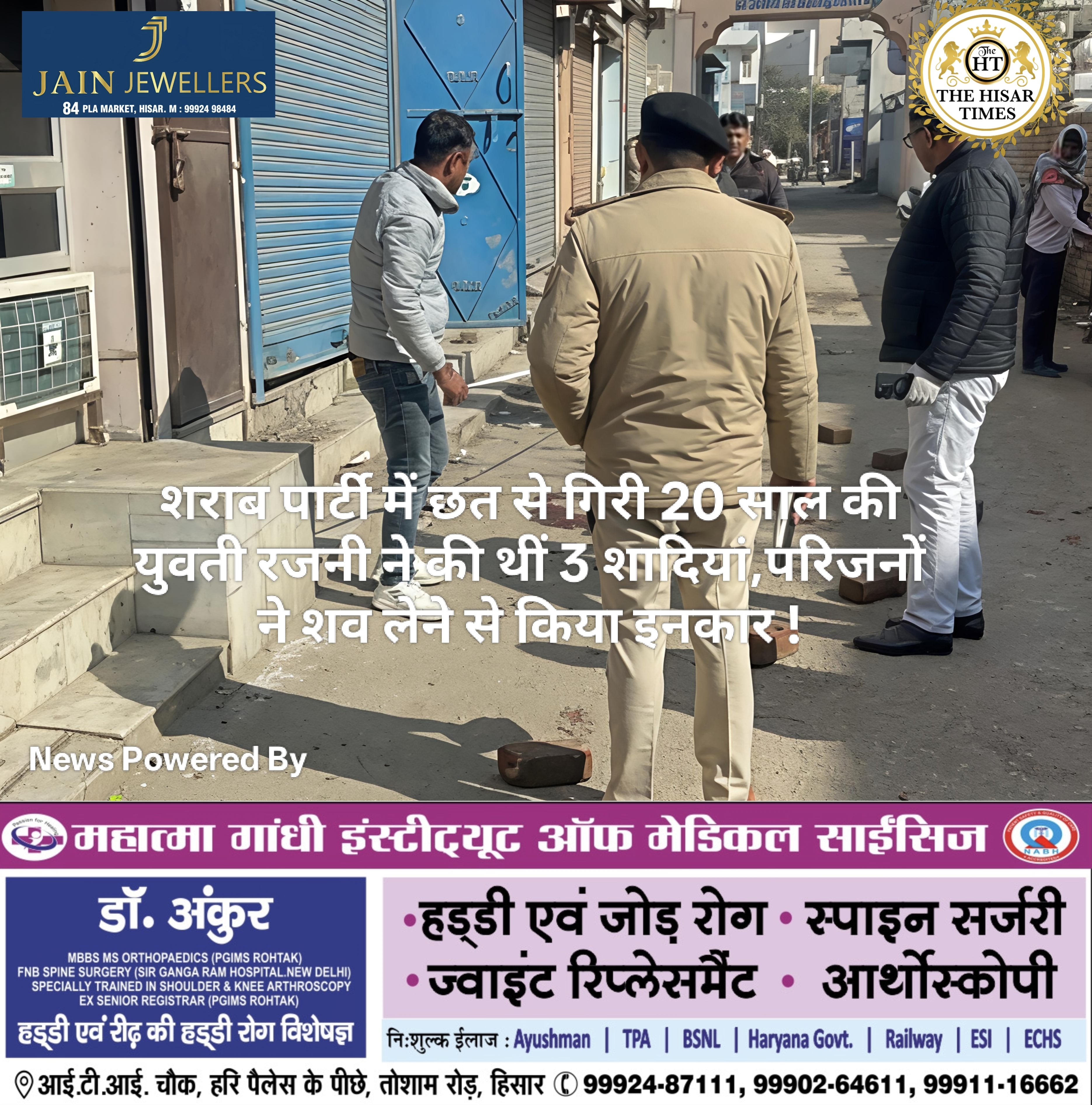 नोट – नीचे कॉलम में देखें > हिसार टाइम्स जॉब्स क्लासिफाइड > आज की बड़ी खबरें फटा फट… For Free Job & News Updates Join Hisar Times News Group https://chat.whatsapp.com/EHzVoGH50MdINoYniG4crH ➖➖➖➖➖➖➖➖➖➖➖➖➖➖➖➖➖➖ हिसार टाइम्स – हरियाणा के हांसी में शराब पार्टी के दौरान छत से गिरकर मृत युवती रजनी (20) के मामले में नया खुलासा हुआ … Continue reading शराब पार्टी में छत से गिरी 20 साल की युवती रजनी ने की थीं 3 शादियां,परिजनों ने शव लेने से किया इनकार !