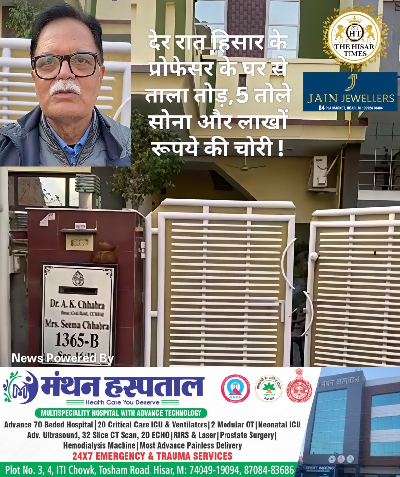हिसार टाइम्स -हिसार शहर के सेक्टर 16-17 स्थित हरियाणा कृषि विश्वविद्यालय (एचएयू) से सेवानिवृत्त प्रोफेसर अशोक कुमार छाबड़ा के घर से बुधवार रात चोर करीब 5 तोला सोने-चांदी के गहने और लगभग डेढ़ लाख की नकदी ले गए। वारदात के समय परिवार घर पर मौजूद नहीं था।