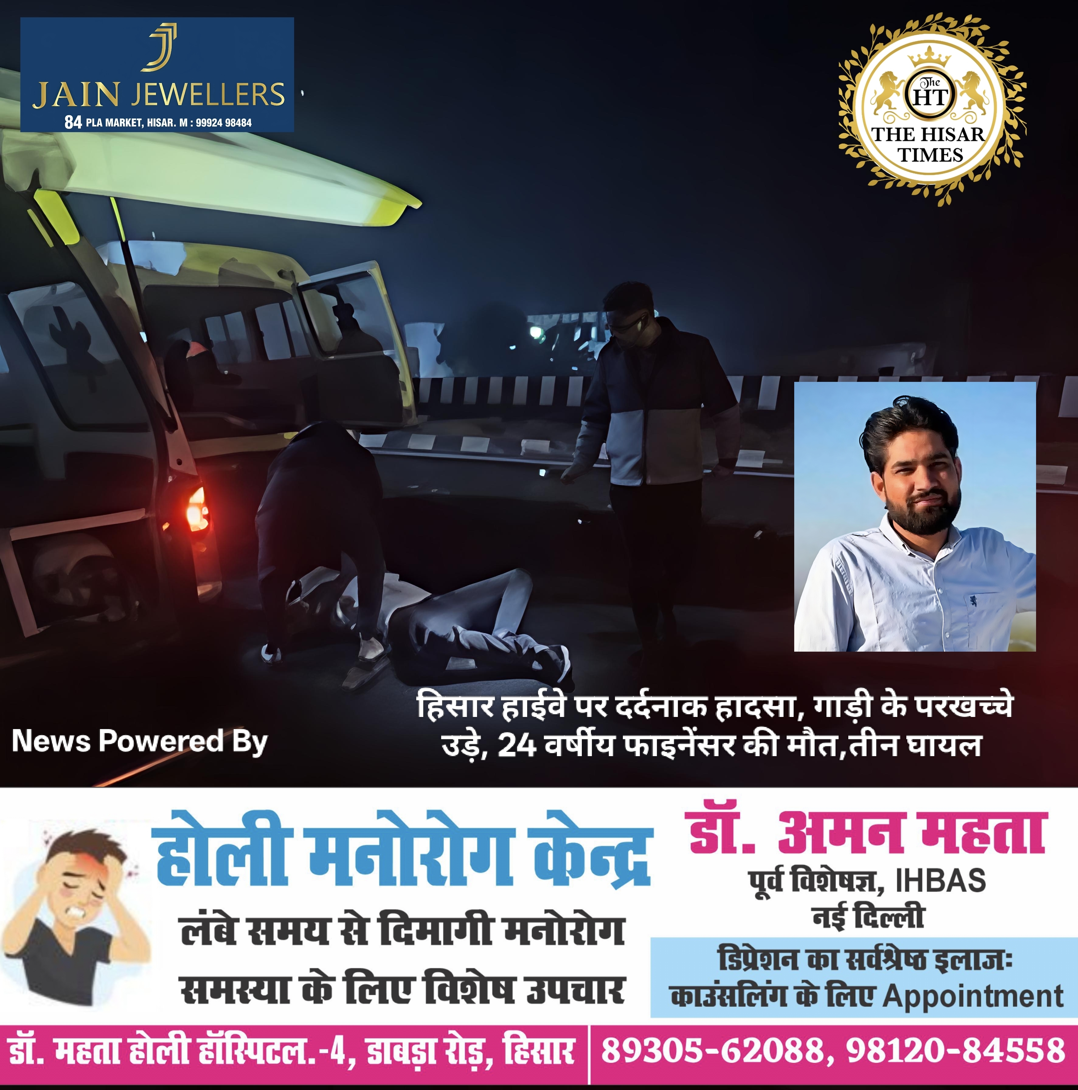 हिसार हाईवे पर दर्दनाक हादसा, गाड़ी के परखच्चे उड़े, 24 वर्षीय फाइनेंसर की मौत,तीन घायल !