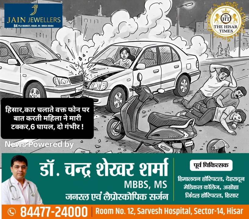 हिसार टाइम्स – दो कारों की भिंडत में छह लोग घायल हो गए। इन दोनों के बीच स्कूटी व बाइक चालक भी आ गए। घायलों को हिसार के निजी अस्पताल में भर्ती कराया गया है। पवन, जोगेंद्र सहित छह लोग घायल हुए हैं। जिसमें दो लोगों की हालत गंभीर बताई जा रही है। देर शाम गोसेवक शिकायत लेकर एचटीएम थाना पहुंचे। देर रात तक इस मामले में केस दर्ज नहीं हो सका था। जानकारी के अनुसार मंगलवार की शाम सीएमसी अस्पताल के पास दो गायों की मौत हो गई थी। गोसेवक गायों को जमीन में दबाने के लिए जेसीबी मशीन को लेकर सेक्टर 1-4 पुल के पास पहुंचे थे।