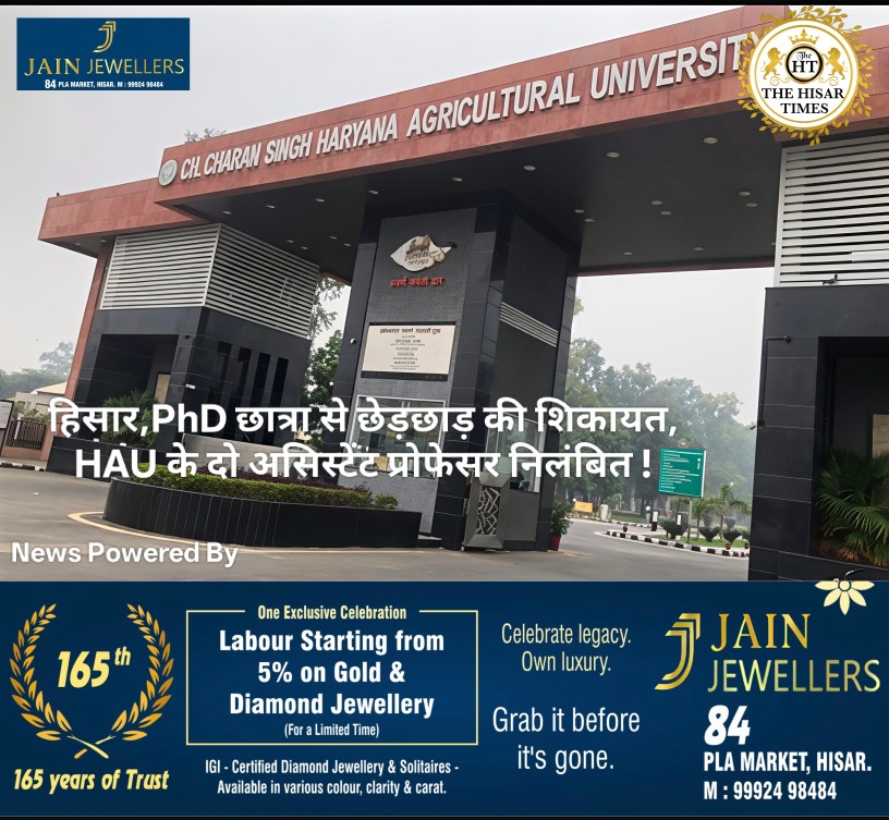 हिसार टाइम्स -हिसार की चौधरी चरण सिंह हरियाणा कृषि विश्वविद्यालय (एचएयू) में पीएचडी की एक छात्रा से छेड़छाड़ का मामला सामने आया है। पीड़िता ने दो असिस्टेंट प्रोफेसर पर आरोप लगाते हुए विवि प्रशासन को बुधवार को दूसरी बार शिकायत दी। इस पर कुलपति प्रो. बीआर कांबोज ने जांच कमेटी गठित करते हुए आरोपी प्रोफेसर नवीन कौशिक व अजीत सांगवान को निलंबित कर दिया है।