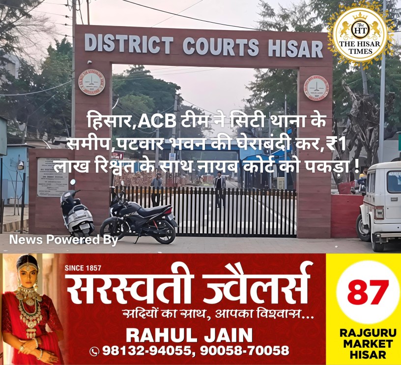 हिसार टाइम्स – भ्रष्टाचार के खिलाफ जारी मुहिम के तहत एंटी करप्शन ब्यूरो (ACB) को एक बड़ी सफलता हाथ लगी है। रोहतक रेंज के अंतर्गत आने वाली झज्जर ACB की टीम ने एक सोची-समझी रणनीति के तहत हिसार जिला अदालत में तैनात नायब कोर्ट को ₹1,00,000 की रिश्वत लेते हुए रंगे हाथों गिरफ्तार किया है। आरोपी की पहचान मुख्य सिपाही सुनील कुमार के रूप में हुई है, जो हिसार के एडीजे कोर्ट नंबर-4 में नायब कोर्ट के पद पर कार्यरत था। यह पूरी कार्रवाई निरीक्षक फतेह सिंह के कुशल नेतृत्व में अंजाम दी गई, जिससे कोर्ट परिसर और पुलिस महकमे में हड़कंप मच गया है।