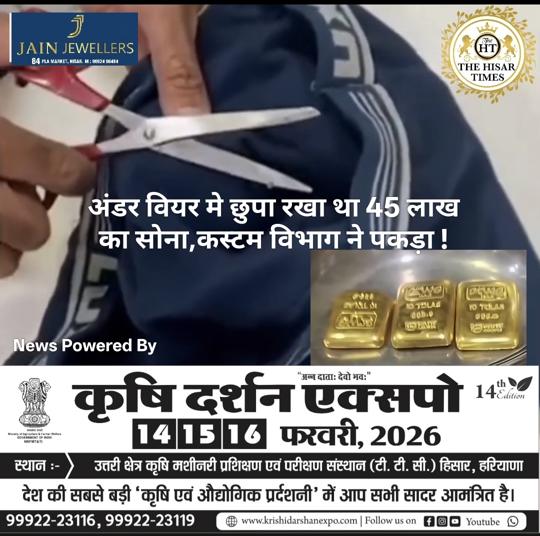 नोट – नीचे कॉलम में देखें > हिसार टाइम्स जॉब्स क्लासिफाइड > आज की बड़ी खबरें फटा फट… For Free Job & News Updates Join Hisar Times News Group https://chat.whatsapp.com/EHzVoGH50MdINoYniG4crH ➖➖➖➖➖➖➖➖➖➖➖➖➖➖➖➖➖➖ हिसार टाइम्स – कस्टम विभाग ने अहमदाबाद एयरपोर्ट पर दुबई के एक शख्स को 96 लाख रुपए के सोने के साथ पकड़ा है। इस … Continue reading अंडर वियर मे छुपा रखा था 45 लाख का सोना,कस्टम विभाग ने पकड़ा !
