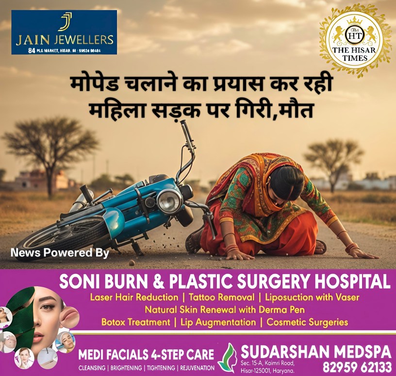 हिसार टाइम्स -हिसार के गांव आर्य नगर में मोपेड चलाने का प्रयास कर रही महिला नीचे गिर गई। इससे महिला के सिर में गंभीर चोटें आईं। परिजन घायल महिला को जिला अस्पताल लेकर पहुंचे, जहां चिकित्सकों ने उसे मृत घोषित कर दिया।