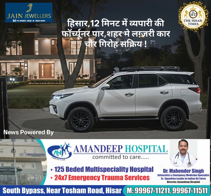 हिसार टाइम्स – हिसार के सेक्टर 9-11 में लग्जरी गाड़ियों को निशाना बनाने वाला एक शातिर गिरोह सक्रिय है, जिसने हाल ही में एक बड़ी वारदात को अंजाम देकर पुलिस की सुरक्षा व्यवस्था को चुनौती दी है। सफल मोटर फैक्ट्री के संचालक निशांत गेरा की कोठी के बाहर खड़ी फॉर्च्यूनर गाड़ी को चोरों ने महज 12 मिनट के भीतर उड़ा लिया। हैरानी की बात यह है कि वारदात को अंजाम देने आए अपराधी खुद भी एक फॉर्च्यूनर गाड़ी में सवार होकर आए थे। सीसीटीवी फुटेज से खुलासा हुआ कि रात करीब 2:01 बजे चोरों ने गाड़ी के ड्राइवर साइड का शीशा तोड़ा और बड़ी सफाई से उसे स्टार्ट कर दिल्ली की ओर फरार हो गए।