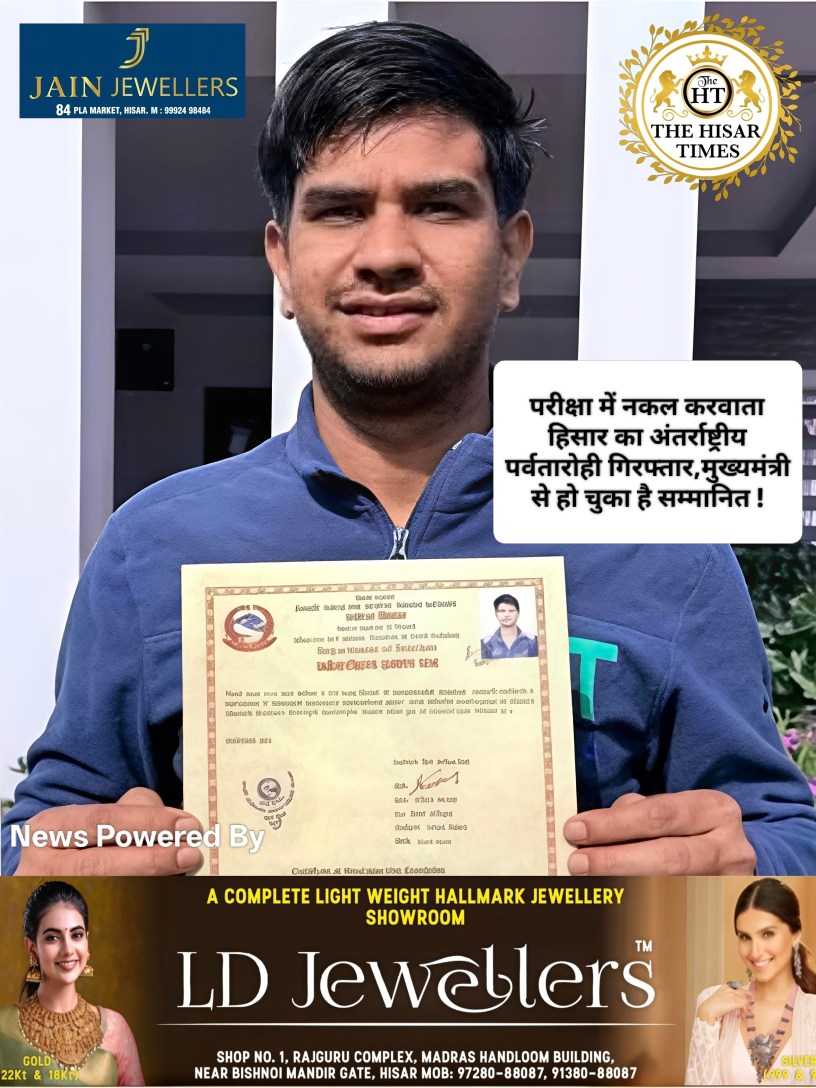 हिसार टाइम्स – माउंट एल्ब्रस जैसी दुनिया की ऊँची चोटियों पर तिरंगा फहराने वाले और हरियाणा के मुख्यमंत्री नायब सिंह सैनी के हाथों सम्मानित हो चुके अंतरराष्ट्रीय पर्वतारोही नरेंद्र कुमार अब सलाखों के पीछे हैं। हरियाणा के हिसार जिले के मिंगनीखेड़ा गांव के रहने वाले नरेंद्र को छत्तीसगढ़ की रायपुर पुलिस ने राष्ट्रीय स्तर की गेट (GATE) परीक्षा में नकल करवाते हुए रंगे हाथों दबोचा है। कभी देश के युवाओं के लिए ‘फिट इंडिया’ के एंबेसडर के तौर पर आदर्श रहे नरेंद्र पर आरोप है कि उन्होंने महज 2 लाख रुपये के लालच में एक परीक्षार्थी को ब्लूटूथ डिवाइस के जरिए पेपर सॉल्व करवाया।