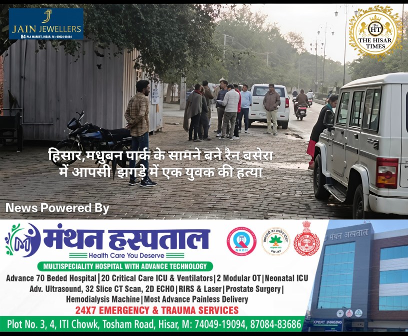 हिसार टाइम्स – मधुबन पार्क के ठीक सामने स्थित अस्थायी रैन बसेरे में बुधवार सुबह एक युवक की लाश मिलने से इलाके में हड़कंप मच गया है। पुलिस के अनुसार, मंगलवार रात बारिश के कारण दो युवक यहां शरण लेने पहुंचे थे। रात में दोनों के बीच किसी बात पर विवाद हो गया, जो मारपीट में बदल गया। बुधवार सुबह अन्य लोगों ने युवक का शव देखा, जिसके शरीर पर चोट के निशान साफ दिख रहे थे।