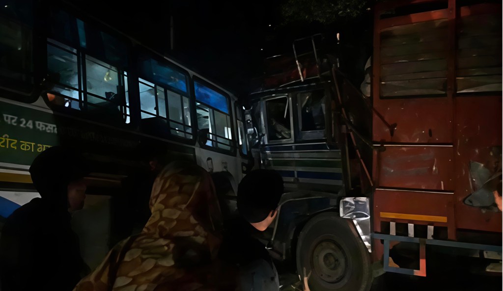 हरियाणा रोडवेज और ट्रक की भीषण टक्कर, ड्राइवर केबिन में फंसा मौत, 12 यात्री घायल !
