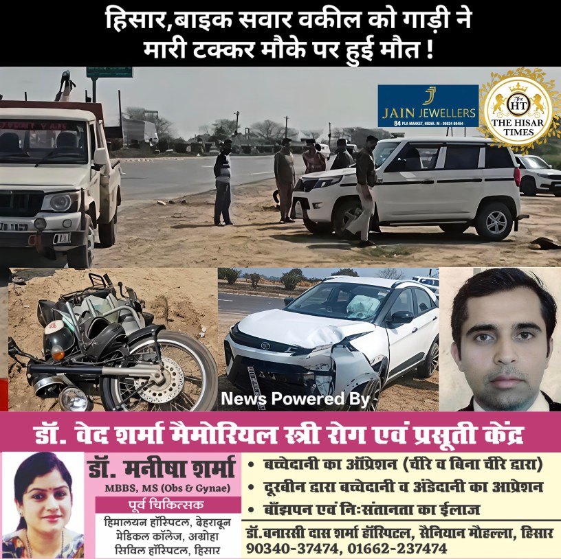 हिसार टाइम्स – हांसी शहर के सिसाय फ्लाईओवर पर रविवार को एक सड़क हादसे में बुलेट सवार वकील रमेश कुमार की मौत हो गई। तेज रफ्तार कार ने उनकी मोटरसाइकिल को टक्कर मार दी, जिससे हेलमेट में दरार आ गई और उन्होंने मौके पर ही दम तोड़ दिया।मृतक की पहचान सिसाय गांव के रमेश कुमार के रूप में हुई है। वह पिछले करीब पांच वर्षों से अपने परिवार के साथ हांसी की वकील कॉलोनी में रह रहे थे। रमेश पेशे से वकील होने के साथ-साथ खेतीबाड़ी भी करते थे और हांसी बार एसोसिएशन के सदस्य थे।