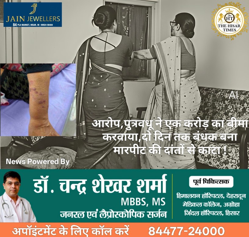 संतोष का आरोप है कि बीमा करवाने के बाद बहू उनके खाने में ऐसी चीजें देने लगी, जिससे उनका शुगर और ब्लड प्रेशर बढ़ जाए और तबीयत बिगड़ जाए। उन्होंने यह भी आरोप लगाया कि बहू उनके साथ मारपीट करती थी और हाथ व गर्दन समेत शरीर के अन्य हिस्सों पर दांतों से काटती थी। महिला का कहना है कि उन्हें दो दिन तक घर में बंधक बनाकर रखा गया। किसी तरह परिजनों को सूचना मिलने पर उन्हें वहां से छुड़वाया गया, जिसके बाद वह हिसार लौट आईं। हिसार पहुंचकर उन्होंने अपने पति और बेटे को पूरी घटना की जानकारी दी। उधर, एचटीएम थाना प्रभारी ईश्वर सिंह ने बताया कि शिकायत मिलने पर नियमानुसार कार्रवाई की जाएगी।