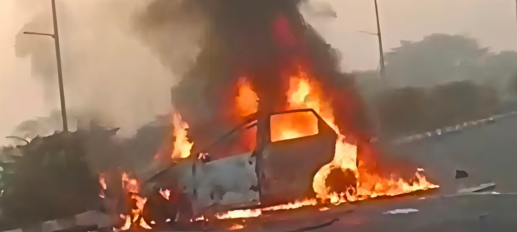 चिकनवास फ्लाईओवर पर कार बनी आग का गोला: रोंग साइड पलटते ही लगी आग, राहगीरों ने बचाई जान