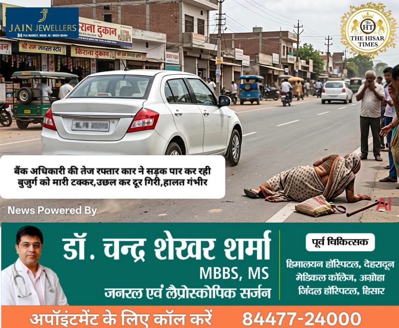 हिसार टाइम्स – हिसार के ऋषि नगर के समीप जगजीवन नगर में एक रोंगटे खड़े कर देने वाला हादसा सामने आया है। यहाँ रहने वाली बुजुर्ग महिला संतरा देवी अपने घर के बाहर सड़क पार कर रही थीं, तभी एक तेज रफ्तार सफेद रंग की कार ने उन्हें जोरदार टक्कर मार दी। टक्कर इतनी भीषण थी कि महिला उछलकर काफी दूर जा गिरीं। यह पूरी घटना पास में लगे एक सीसीटीवी (CCTV) कैमरे में रिकॉर्ड हो गई है, जिसमें साफ देखा जा सकता है कि चालक ने लापरवाही से गाड़ी चलाते हुए बुजुर्ग को टक्कर मारी और रुकने के बजाय मौके से फरार हो गया।