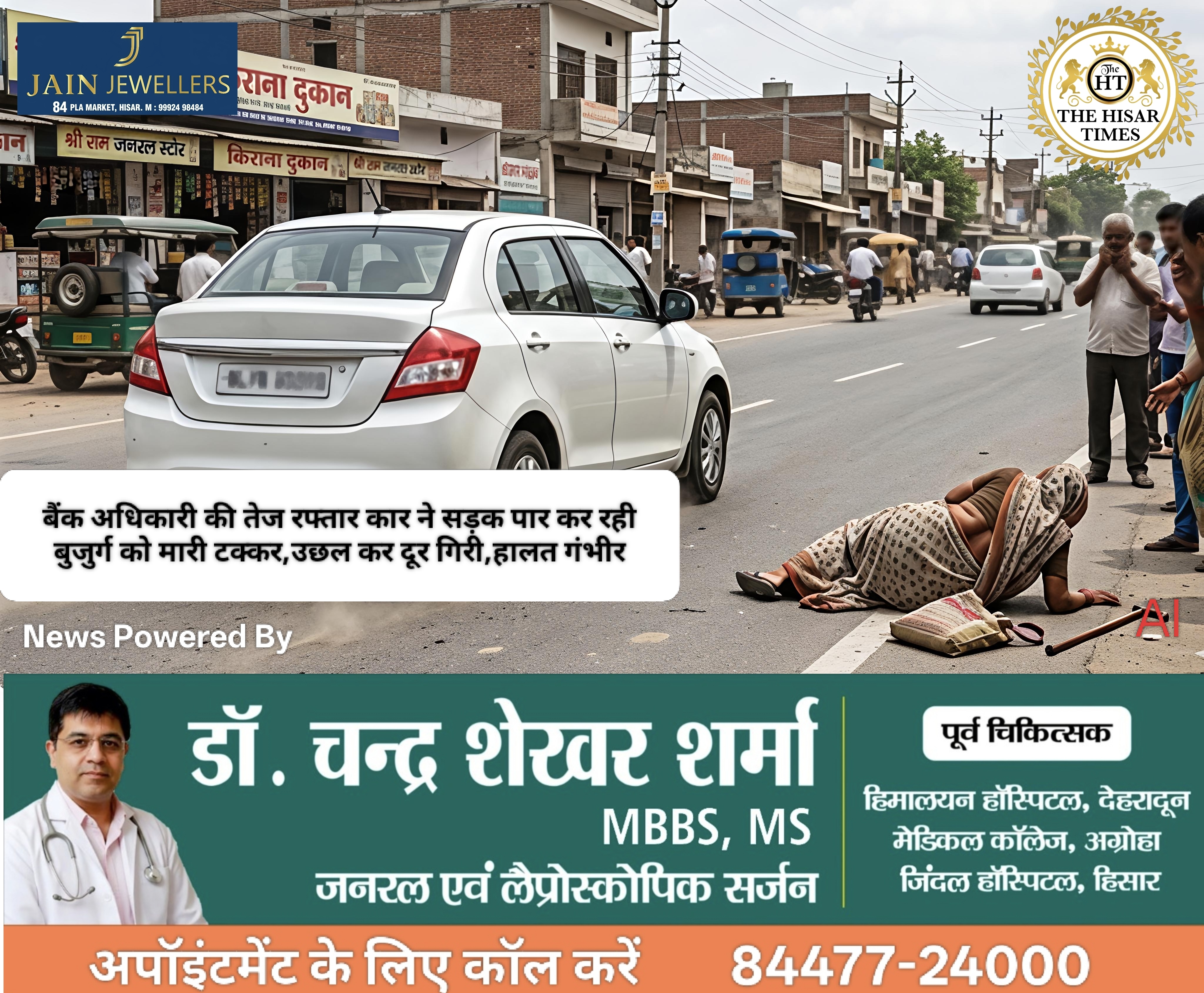 नोट – नीचे कॉलम में देखें > हिसार टाइम्स जॉब्स क्लासिफाइड > आज की बड़ी खबरें फटा फट… For Free Job & News Updates Join Hisar Times News Group https://chat.whatsapp.com/EHzVoGH50MdINoYniG4crH ➖➖➖➖➖➖➖➖➖➖➖➖➖➖➖➖➖➖ हिसार टाइम्स – हिसार के ऋषि नगर के समीप जगजीवन नगर में एक रोंगटे खड़े कर देने वाला हादसा सामने आया है। यहाँ रहने … Continue reading बैंक अधिकारी की तेज रफ्तार कार ने सड़क पार कर रही बुजुर्ग को मारी टक्कर,उछल कर दूर गिरी,हालत गंभीर !